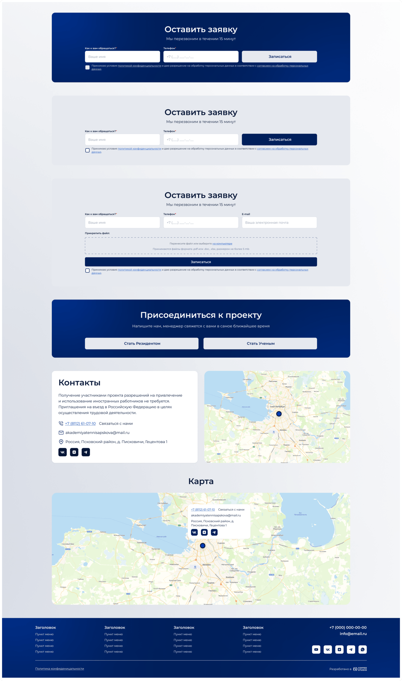 Удалось найти идеальный баланс в дизайне — строгий синий корпоративный цвет гармонично сочетается с современными элементами вроде глассморфизма и плавных анимаций. Волнообразные формы и градиенты добавили проекту необходимую динамику.