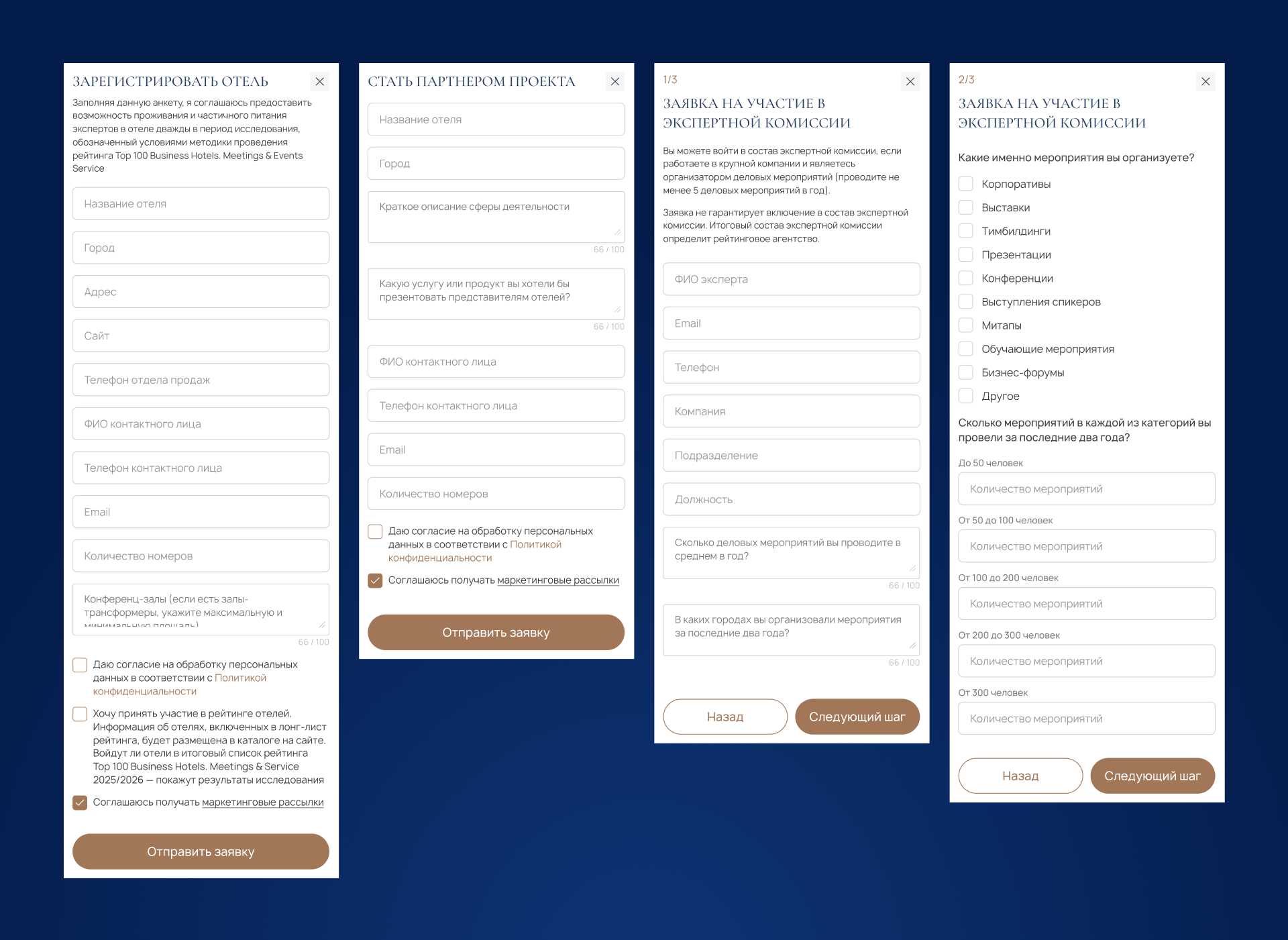 Параллельно мы работали с заявками и формами. Казалось бы, стандартная история — форма обратной связи. Но клиент хотел, чтобы сайт жил своим сообществом. Поэтому мы разработали заявки на регистрацию отеля, формы для участия в экспертной комиссии, анкету «Стать экспертом». Логика простая: человек заполняет форму, заявка отражается в административной панели, а менеджер проверяет и вручную публикует. Так портал сам формирует профессиональное сообщество вокруг рейтинга.