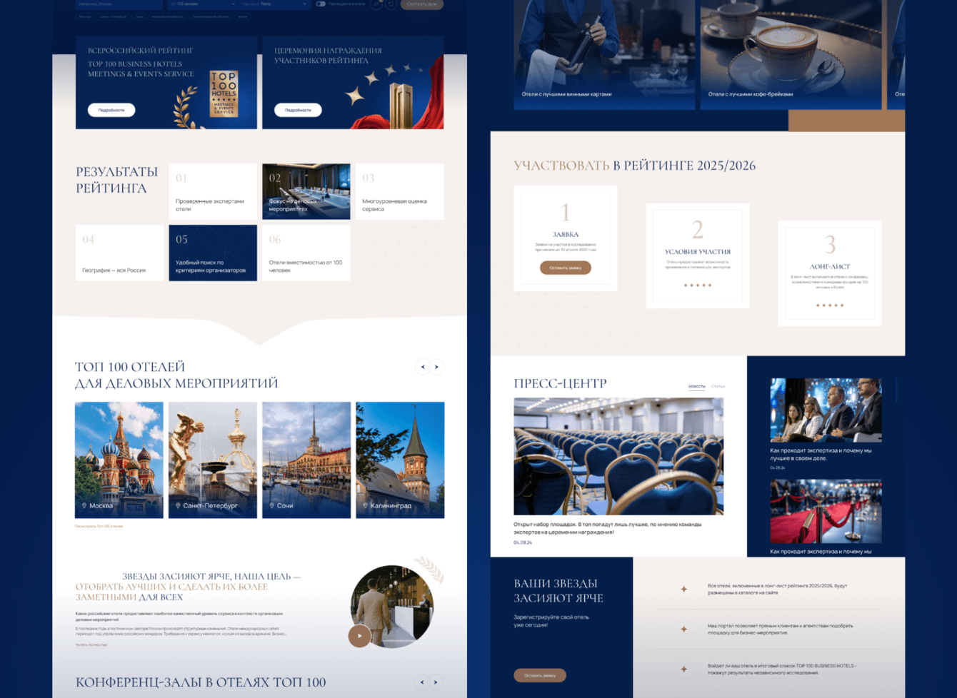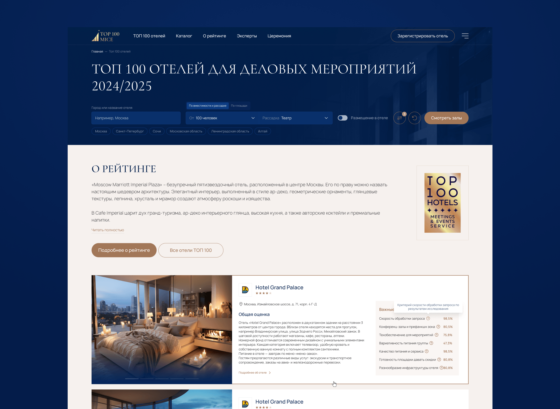 Эксперты. Через портал формируется профессиональное сообщество. Эксперты подают заявки прямо на сайте, проходят модерацию и становятся частью рейтинга. Система ТОП‑100 создает конкурентную среду: отели стремятся попасть в список лучших, а пользователи понимают, что перед ними не случайный набор площадок, а проверенные объекты.