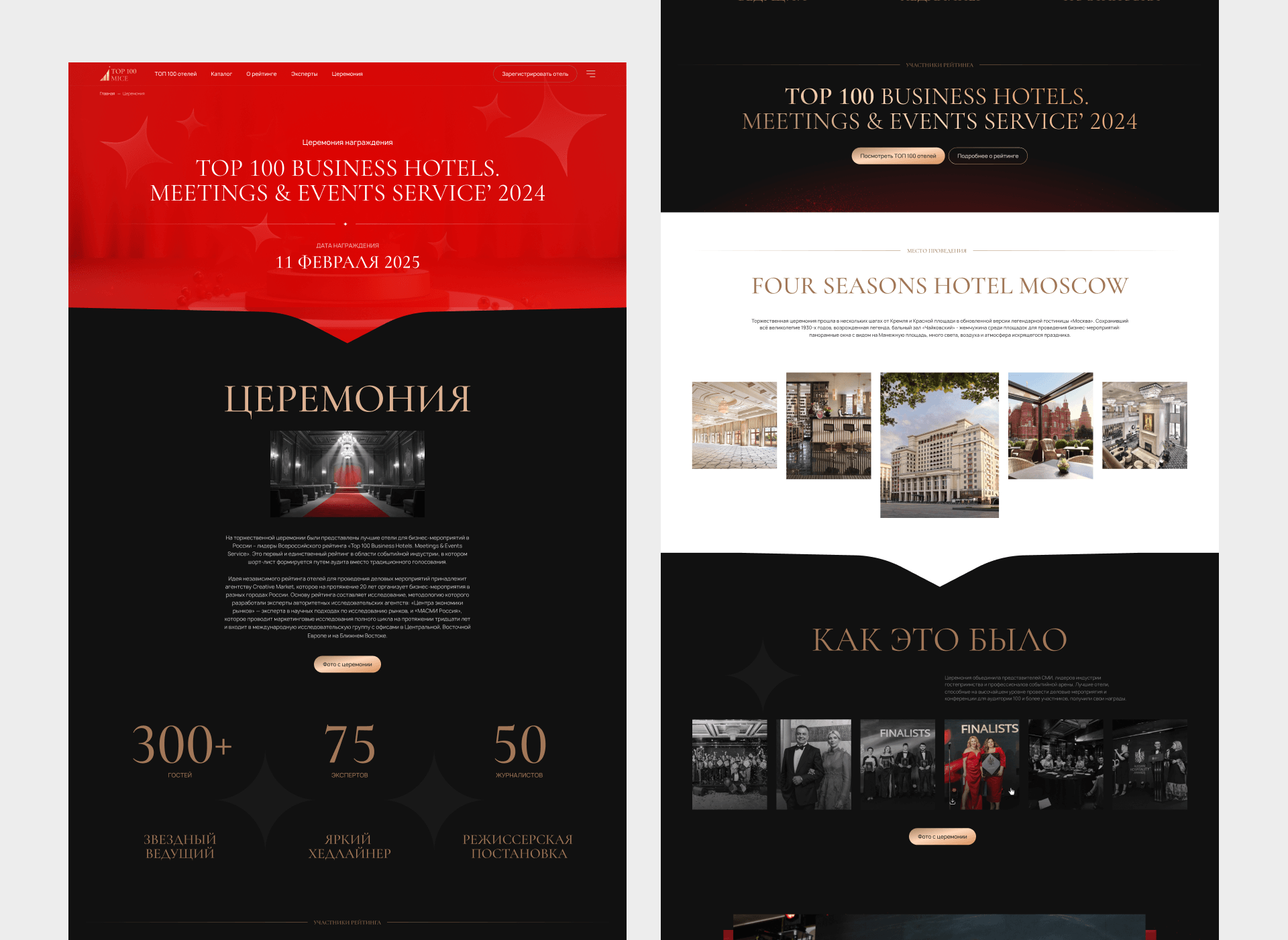 Следующим шагом была страница с премией и церемониями. Этот раздел нужно обновлять регулярно. Мы создали административную панель, где администратор может внести новую церемонию, загрузить фото с мероприятия, отметить победителей. Мы рассказали, как пользоваться админкой, поэтому сейчас администратор обновляет контент без команды разработчиков.