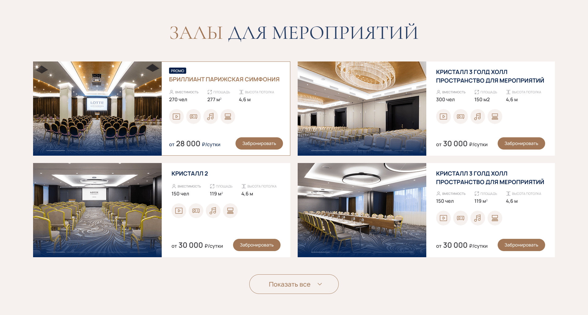 У каждого отеля могут быть несколько залов. Поэтому мы сделали разные карточки: отдельно для самого отеля и отдельно для конференц-зала. Это было важно: один пользователь выбирает площадку под мероприятие, а другой — оценивает сам отель в целом.