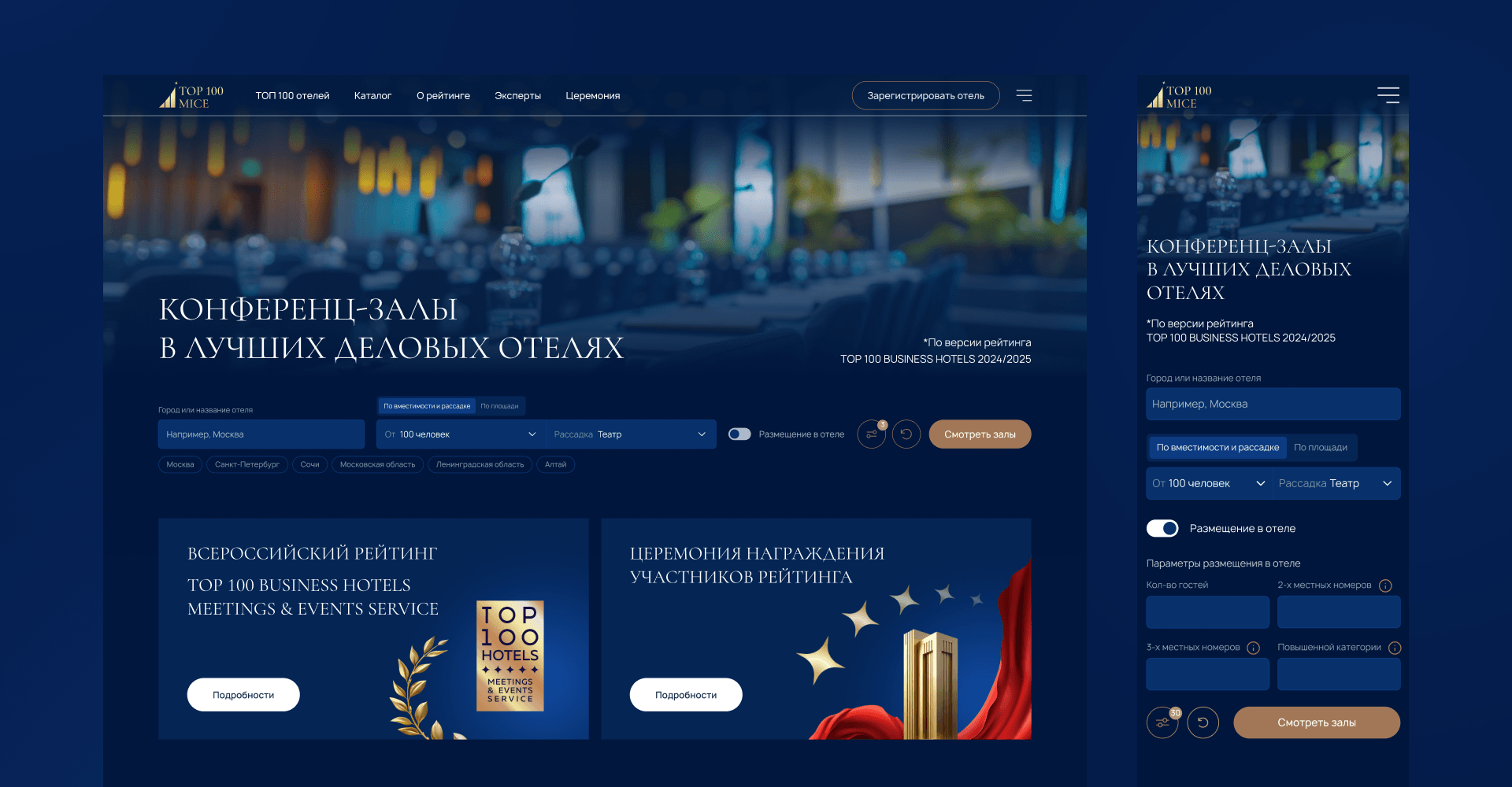 Клиент хотел получить полноценный сервис, где компании, организующие бизнес-мероприятия, смогут находить площадки под любые задачи — от камерной переговорной на 10 человек до зала-трансформера на 500 гостей с банкетной рассадкой.