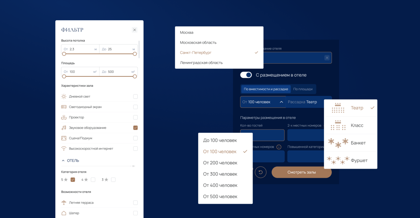 Фильтрация получилась сложной, но при этом удобной. Пользователь может за несколько секунд задать параметры и увидеть только подходящие залы. Это экономит время и делает работу сайта по-настоящему полезной для бизнеса.