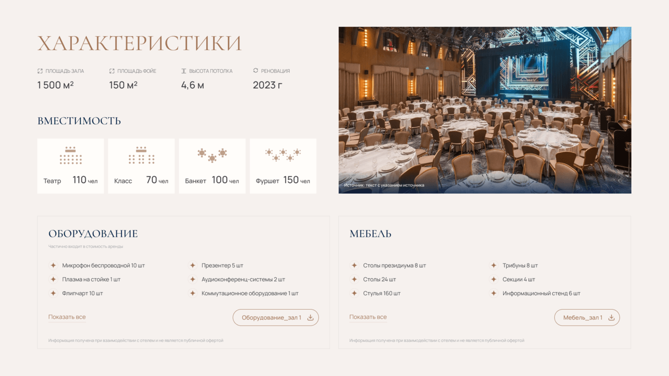 Площадки и отели. Они получили не «сухой список», а полноценный профайл. С фотографиями, характеристиками залов, видеообзорами. Плюс личный кабинет. Отель может сам вносить изменения, загружать фото и описания, добавлять новые залы. Благодаря этому информация на сайте не устаревает. Площадка получается похожа на онлайн-витрину, на ней удобно искать, сравнивать и быстро выбирать.