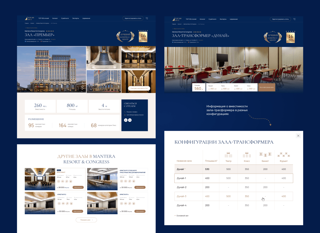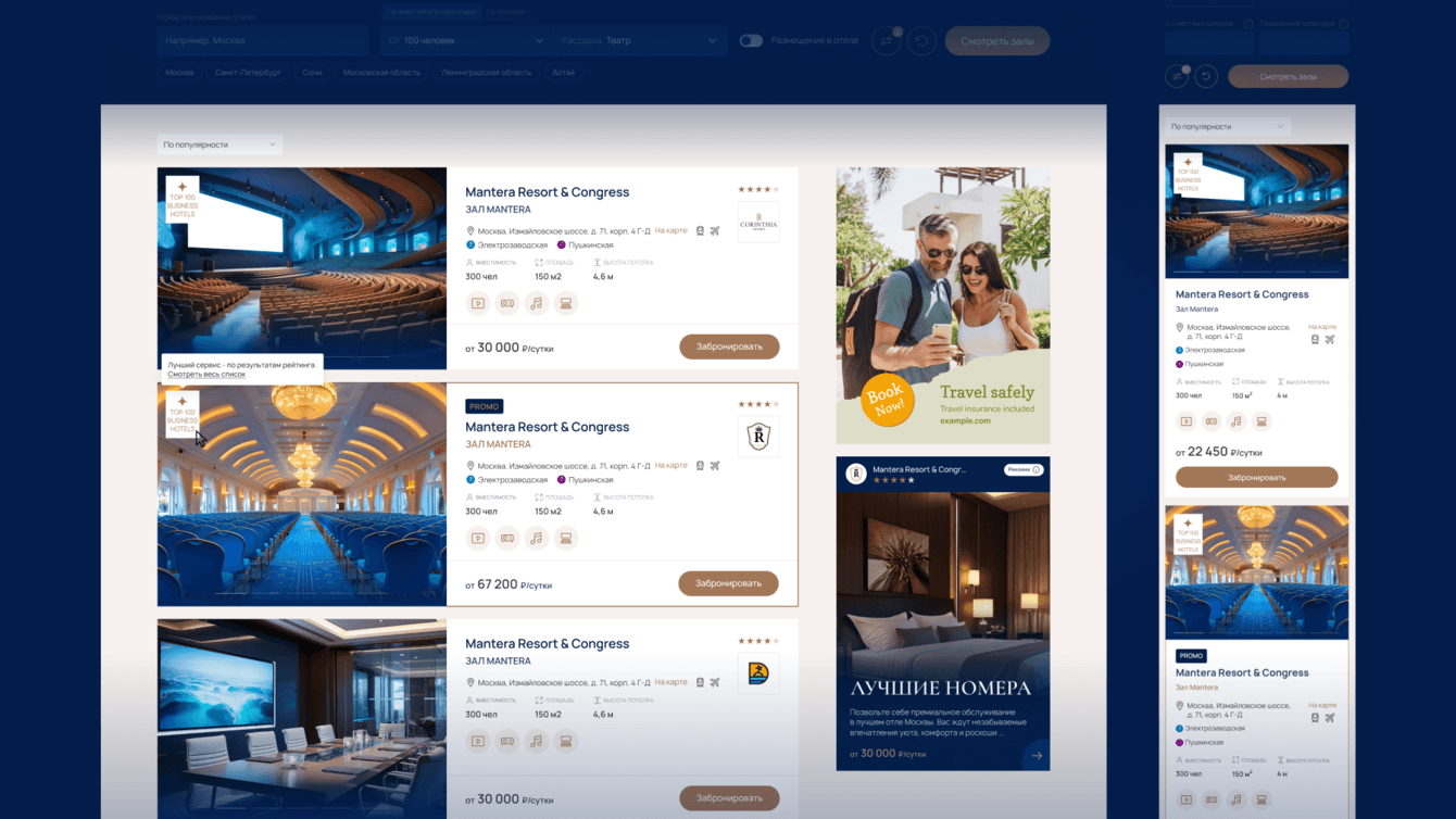Сначала мы сделали карточки отелей. Это было естественным шагом: отель должен презентовать себя целиком — с описанием, фотографиями, рейтингом, экспертными комментариями. Но быстро стало понятно, что этого недостаточно. Главный интерес пользователей был не в отеле, а именно в зале для мероприятий. Поэтому мы сделали отдельный тип карточек — карточку зала.