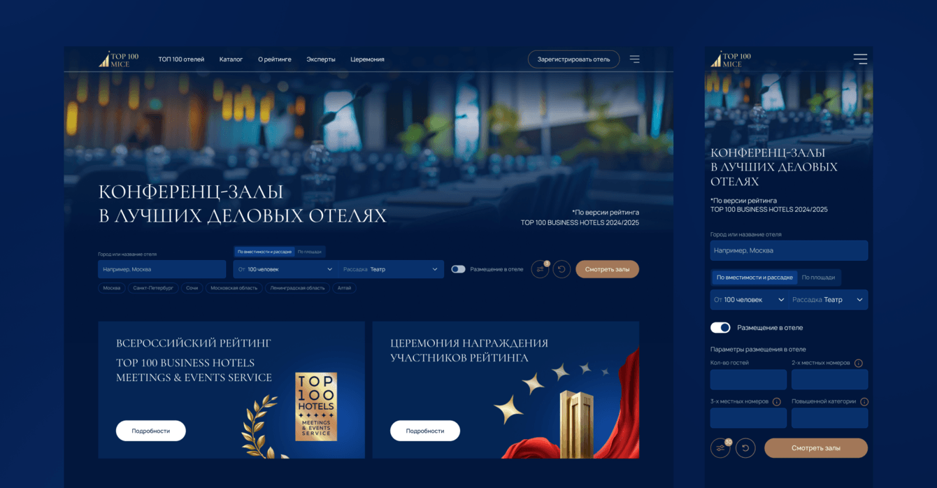 После того, как мы продумали каталог и фильтрацию, нужно было сделать так, чтобы сайт не выглядел нагроможденным конструктором, а работал для разных ролей: организатора, владельца отеля, эксперта. Проект пришлось собирать как мозаику — слой за слоем.