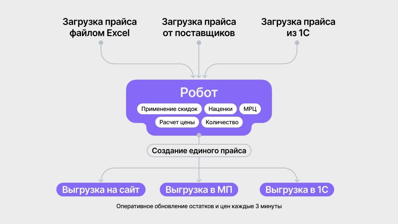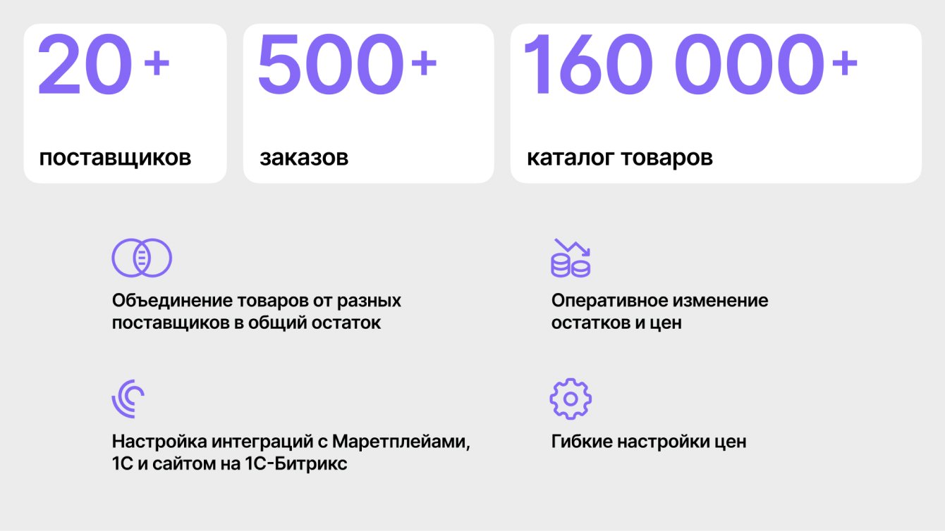При создании интернет-магазинов мы поняли, что нужен сервис, который позволит управлять товарами (описанием, ценами, скидками и остатками у поставщиков) как на сайте интернет-магазина клиента, так и в его каталогах на маркетплейсе.