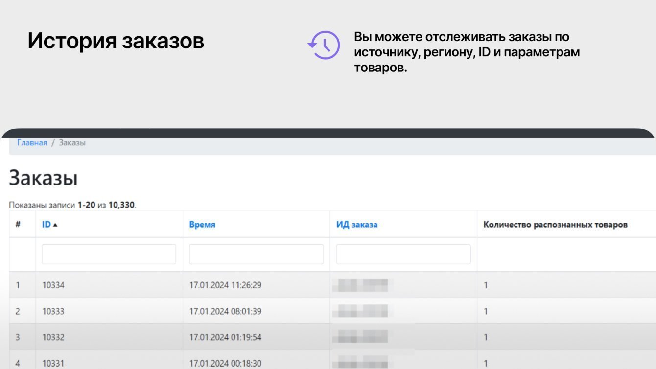 Есть возможность отслеживать заказы по источнику (сайты, маркетплейсы), региону, ID и параметрам товаров. Это позволяет анализировать продажи, оптимизировать процессы и улучшать качество обслуживания.