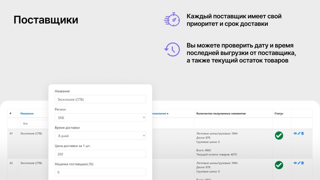 Включает в себя информацию о названии поставщика, его регионе, времени и цене доставки, наценке поставщика, приоритете склада, порядке обработки складов, а также выбор формата данных для загрузки (json, api, xml, csv). Кроме того, можно указать адрес доставки, время доставки и контактное лицо для связи по вопросам доставки.