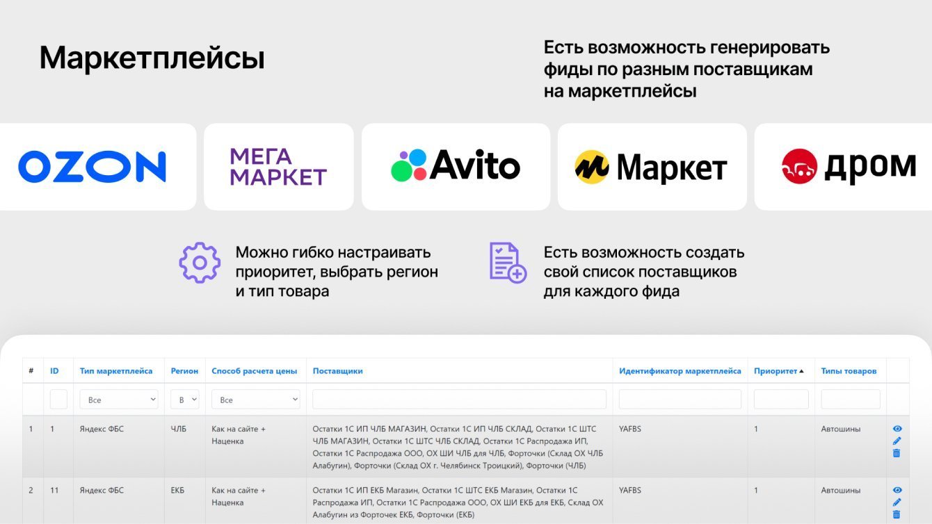 Содержит информацию о типе маркетплейса, его приоритете, регионе, идентификаторе, фильтре брендов, способе расчета цены, фильтре по типу товаров и поставщиков. Предусмотрена возможность подключения всех популярных площадок, таких как Яндекс.Маркет, Wildberries, Ozon, Avito, AliExpress, Drom, СберМаркет, Вконтакте, Едадил и других, а также любых площадок по желанию заказчика.