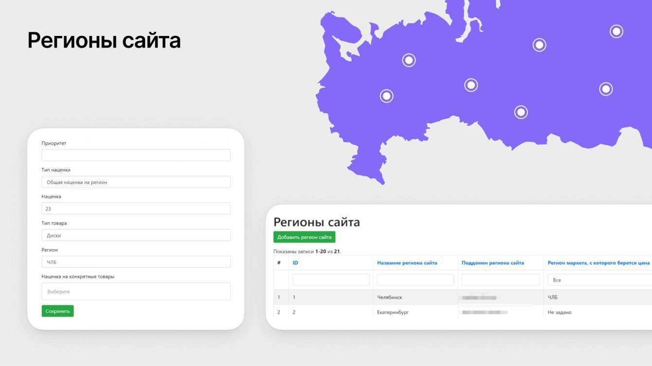 Есть возможность фильтровать товары по сайту и поддоменам, а также по каталогам на маркетплейсах. Можно настроить показ нужного списка товаров для разных регионов. Есть возможность выбрать маркет, с которого будет браться цена.