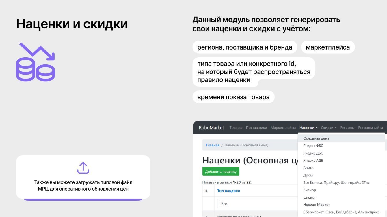Можно редактировать цены и скидки для некоторых товаров. При этом цены на маркетплейсе будут автоматически заполняться данными с сайта или из 1С. Есть возможность выбрать тип наценки: по региону, поставщику, типу товара, бренду или списку конкретных товаров по ID.