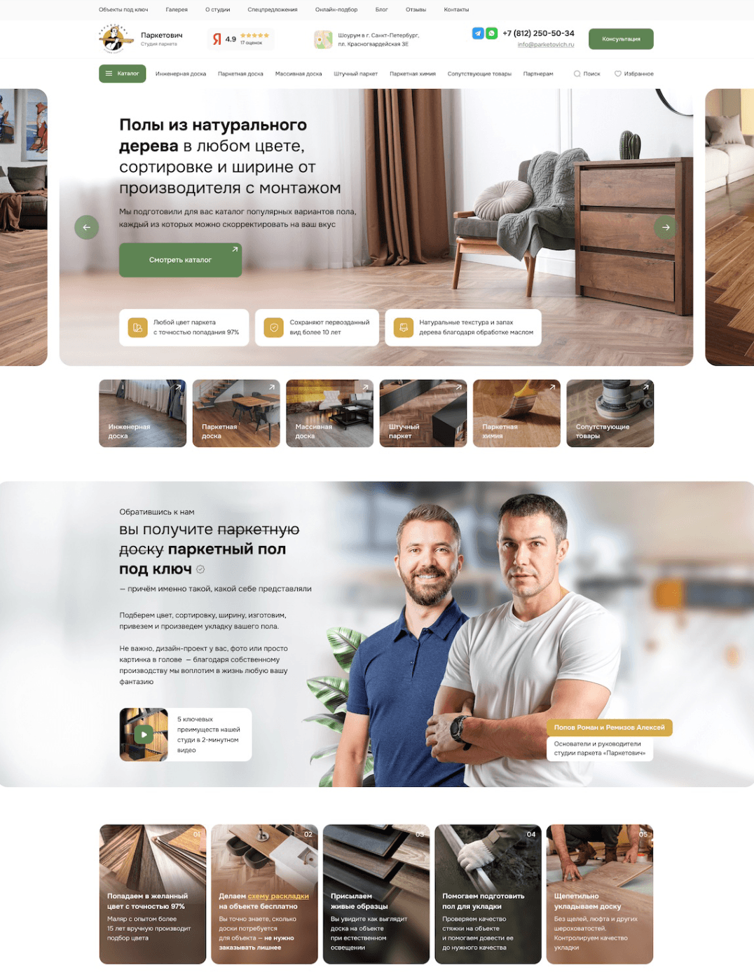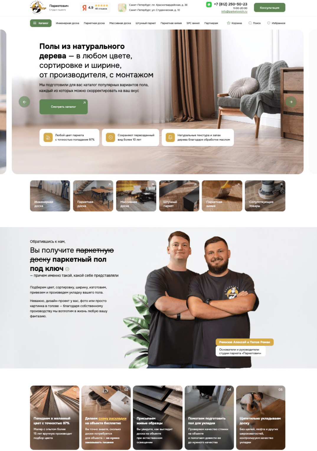 Когда к нам обратились соучредители компании «Паркетович», мы сразу почувствовали: это не просто магазин напольных покрытий, а команда, которая живет своим делом и ценит системный подход. С 2016 года «Паркетович» помогает жителям Санкт-Петербурга и области выбрать и установить натуральные напольные покрытия, а также сопутствующие материалы. За плечами - собственное производство, склад, шоурумы, многолетний опыт и желание развиваться дальше.