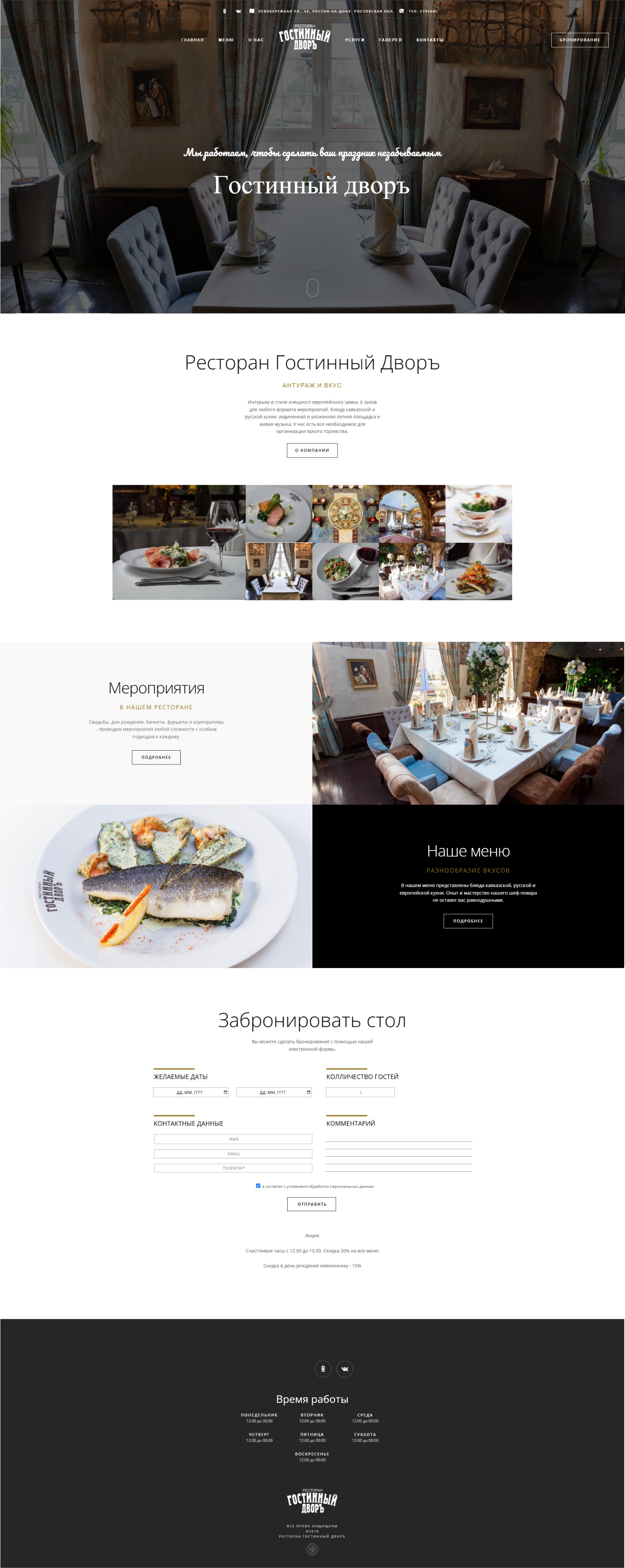 Мы полностью преобразили сайт ресторанного комплекса «Гостинный дворъ», создав современную и стильную платформу в винтажной эстетике. Теперь посетители могут легко ознакомиться с меню, услугами и акциями, а также забронировать зал для мероприятий в несколько кликов. Сайт стал не только удобным инструментом для клиентов, но и мощным каналом для продвижения уникальной атмосферы ресторана.