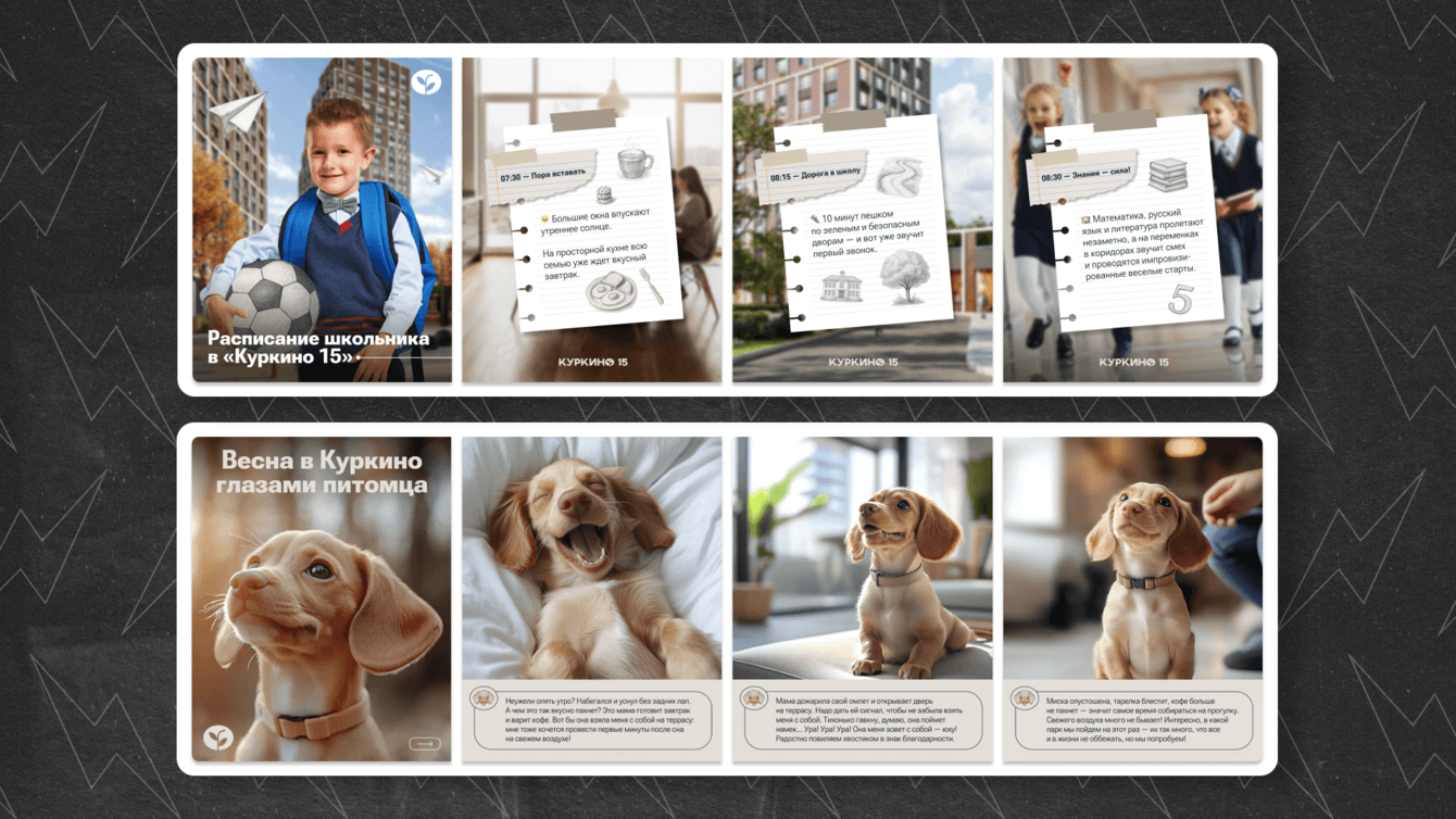 Перестроили подход к визуалам: рендеры рассматривались не как финальные картинки, а как отправная точка для создания креативного контента. Основной принцип — строить коммуникацию от перспективы будущего жителя, показывая не только дом, но и повседневную жизнь вокруг него.