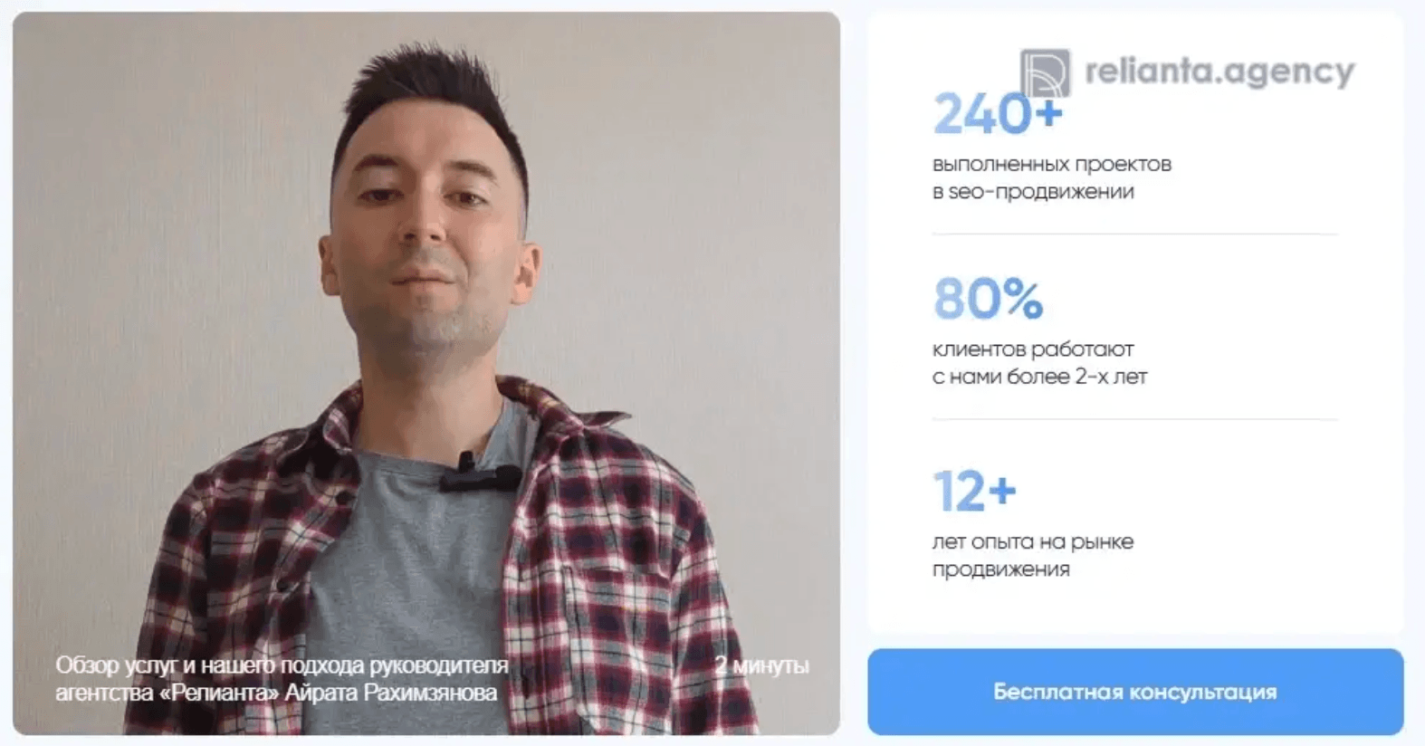 И в июле 2024 года сайт был запущен, точнее лендинг — это была всего лишь одна страница. С этого мы начали. Видео позже на главной обновили. С этого момента стало не стыдно показать сайт клиентам или упомянуть где-то в контактах.