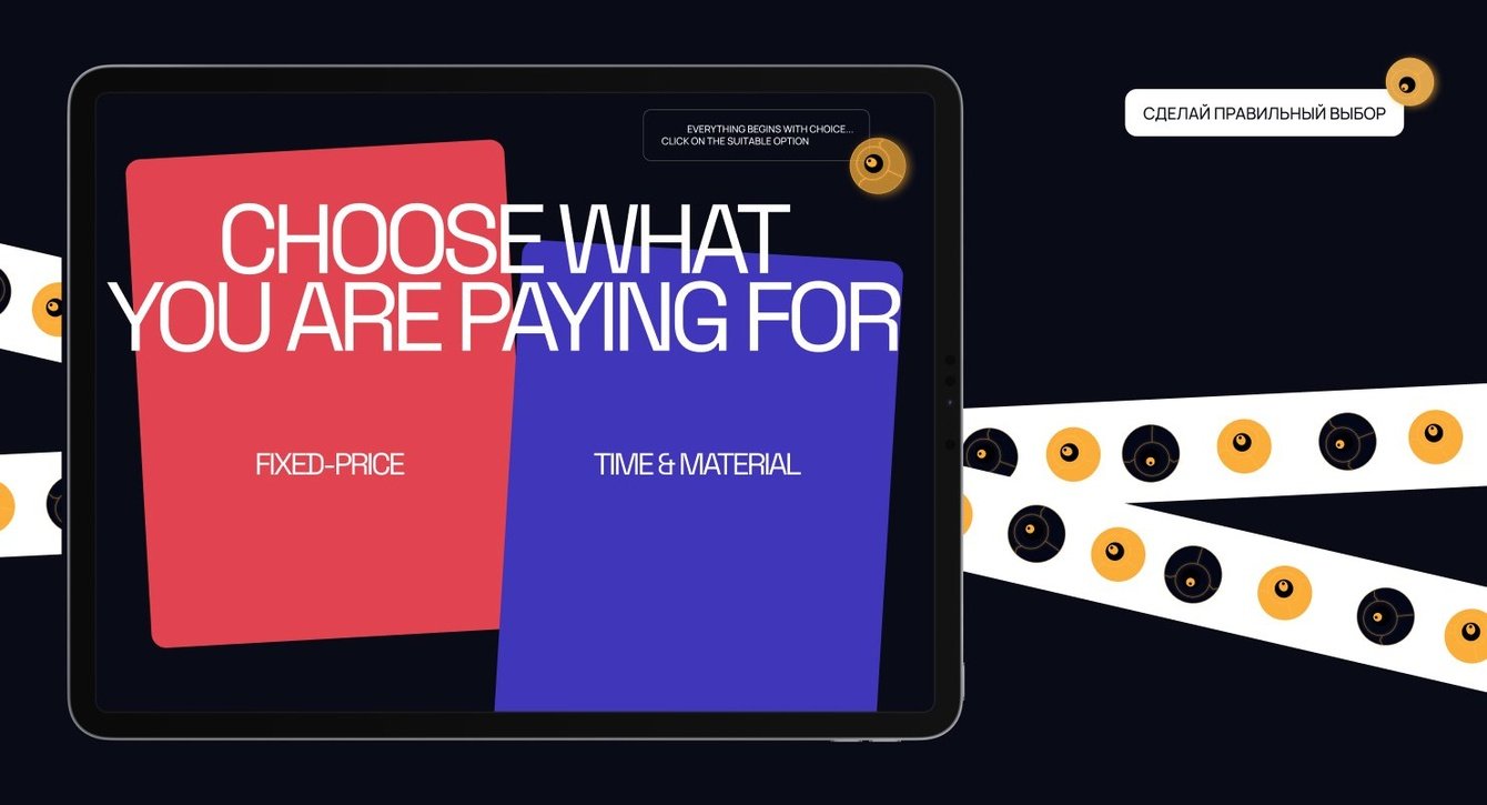 Для сферы айти нетипично наличие на сайте некой большой идеи — как правило, это нагромождение трендовых дизайнов и минимум спецификации. Поэтому, визуальный бэкграунд — его продуманность, понятный лейтмотив на протяжении всего сайта — качественно выделяет нас на уровне дизайна. Вербально же, все наши заголовки креативны, живут в одной реальности и раскрывают работу компании, чего уже оказалось с лихвой достаточно для создания эффективной, убедительной коммуникации.