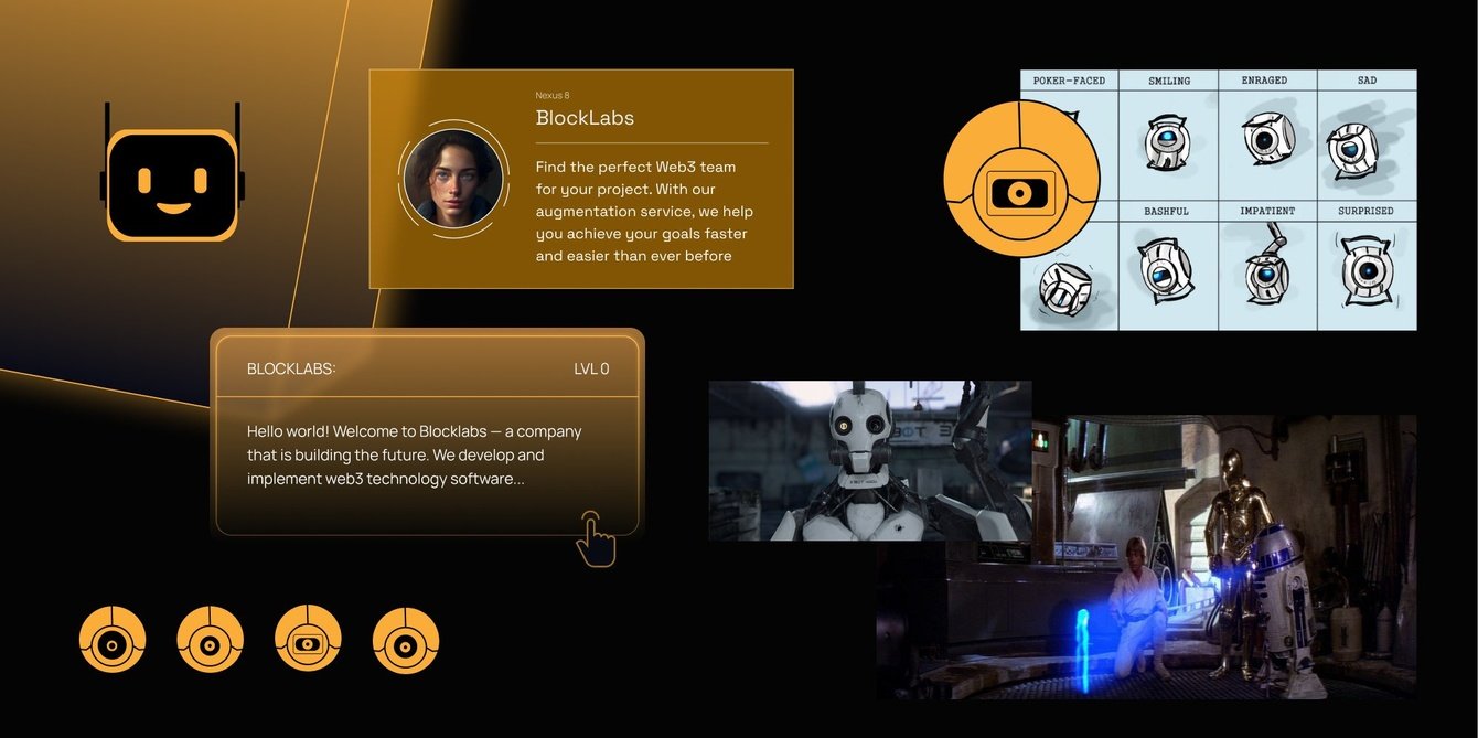 В процессе мозгового штурма мы решили, что наш интерактивный персонаж должен выступать в роли гида по заводу и общаться с пользователем, рассказывая ему о том, как устроен «Завод Блоклабса».