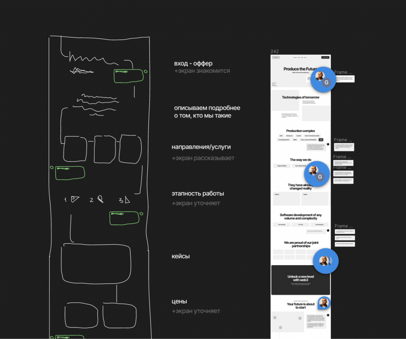 Придумать что-то новое в сайте для IT достаточно сложно: в сфере уже сложились визуальные и смысловые каноны: в основном темная тема, какие-то 3D-шки, «концептуальные» заголовки… Мы стали думать, как реализовать на нашем сайте и сделать «по-другому», но при этом выдержать типичную для сфере стилистику. В ходе мозгового штурма мы пришли к 3-м концептуальным идеям, которые могли стать основой сайта.