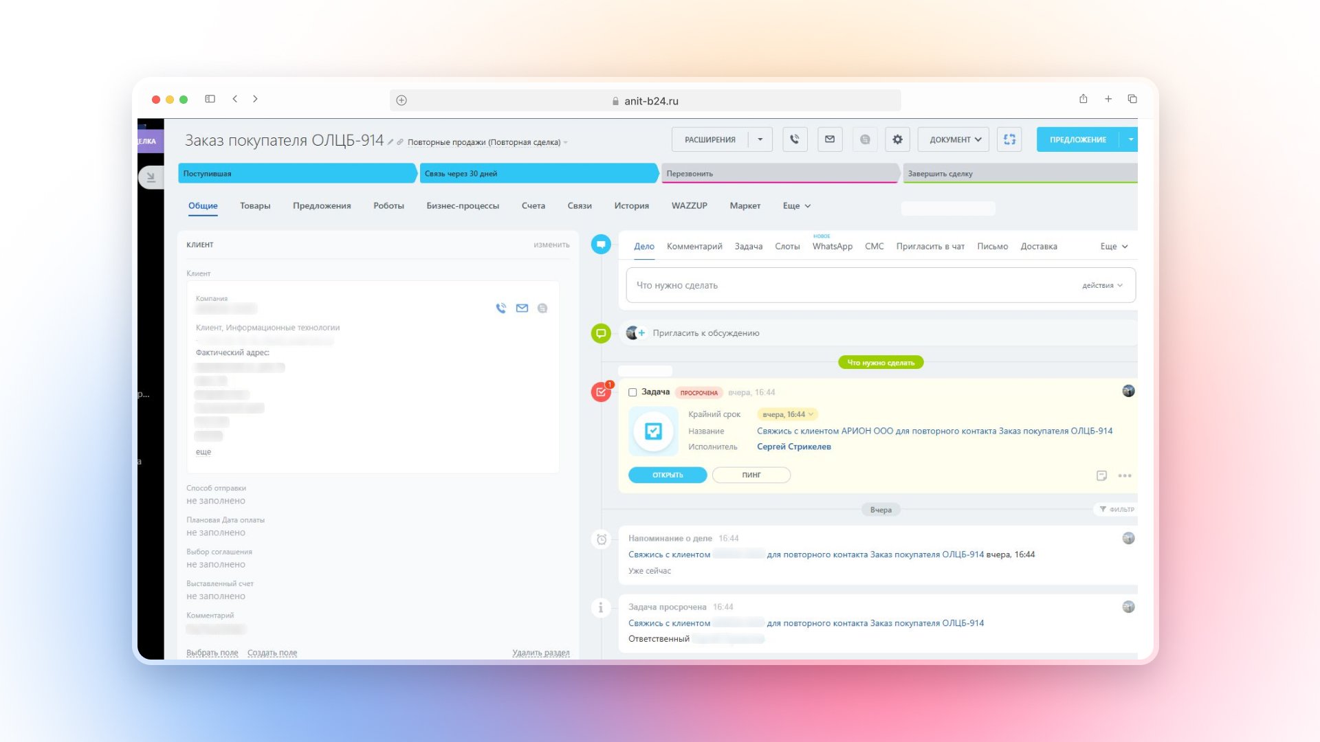 Через 30 дней сделка автоматически активируется. Менеджер получает задачу: связаться с клиентом и выяснить интерес к повторному заказу. Если интерес подтверждён — создаётся новый заказ в 1С и сделка возвращается в прямую воронку. Если нет — фиксируется причина отказа.