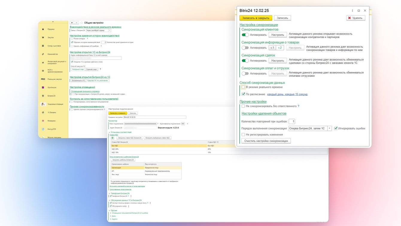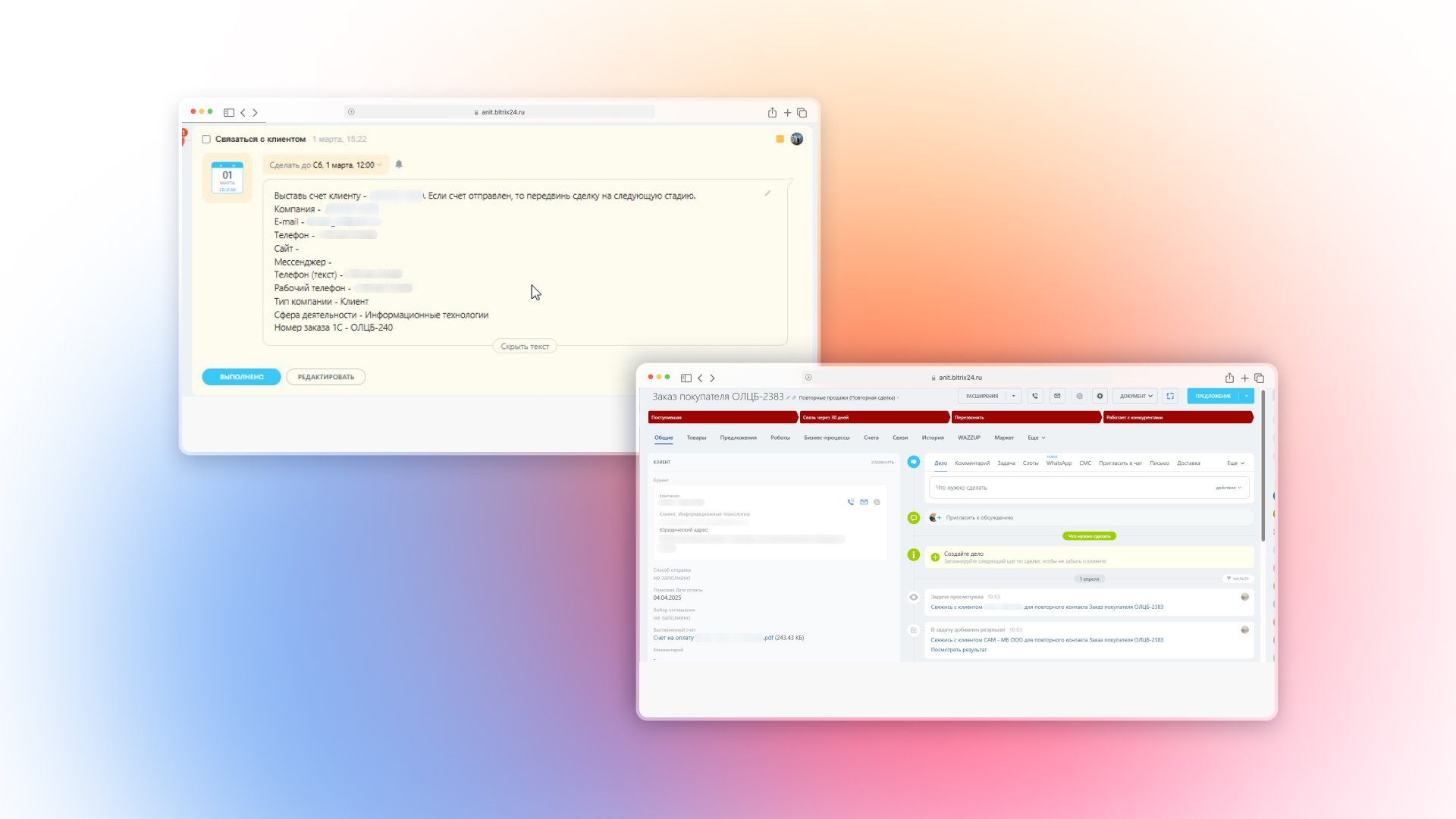 Цель проекта — адаптировать Битрикс24 под текущие процессы, обеспечить стабильную интеграцию с 1С, внедрить систему контроля сделок и автоматизировать возврат к клиенту после завершения первичного заказа.