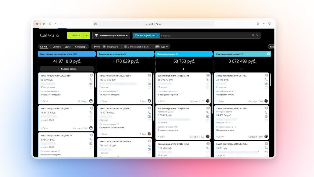 Теперь менеджеру не нужно сверяться с учётной системой — CRM показывает, на каком этапе находится заказ, какие действия требуются и что уже выполнено.