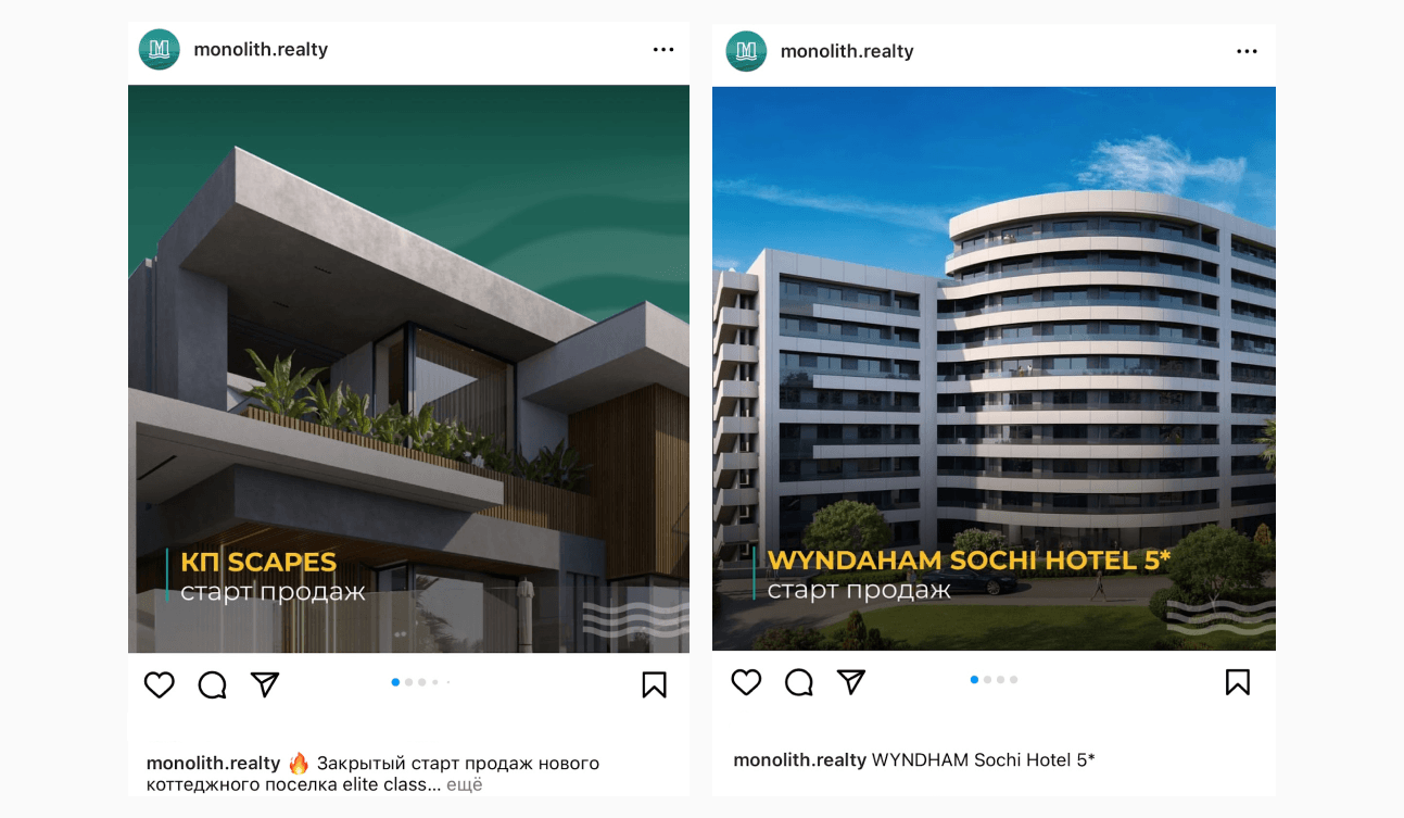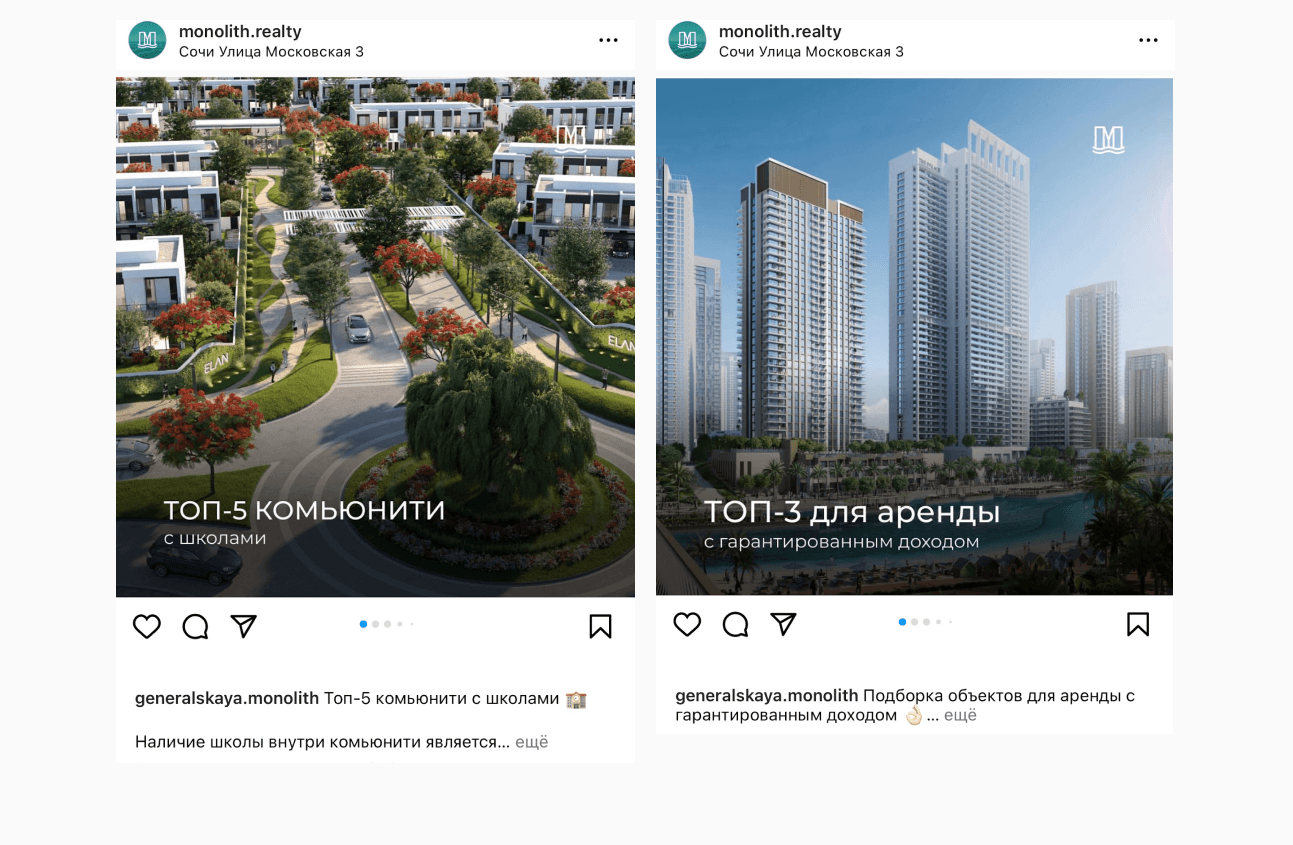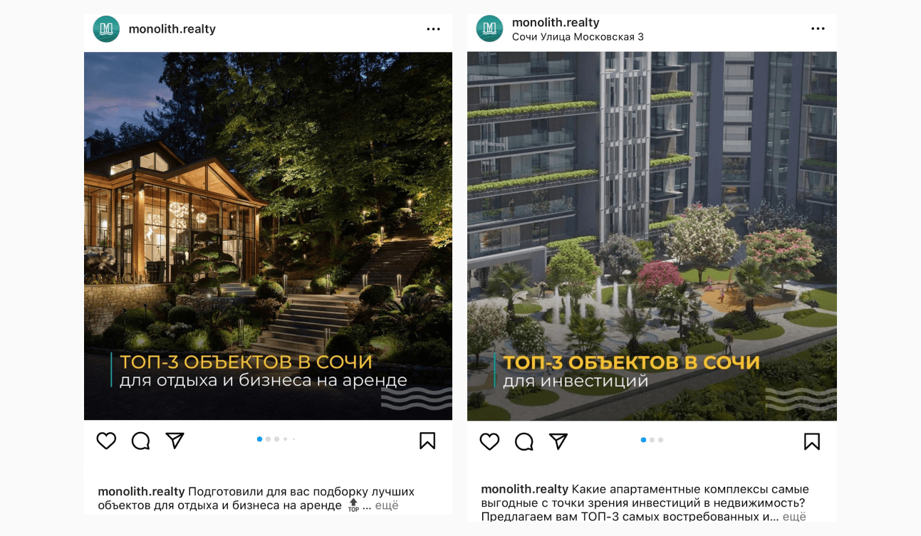 В аккаунте мы продавали курортный образ жизни под теплым солнцем. Здесь активно использовался видеоконтент: показывали город Сочи с его атмосферой, показывали команду, подсвечивали актуальные новости, а эксперты рассказывали про рынок недвижимости, объектах и о преимуществах городов.
