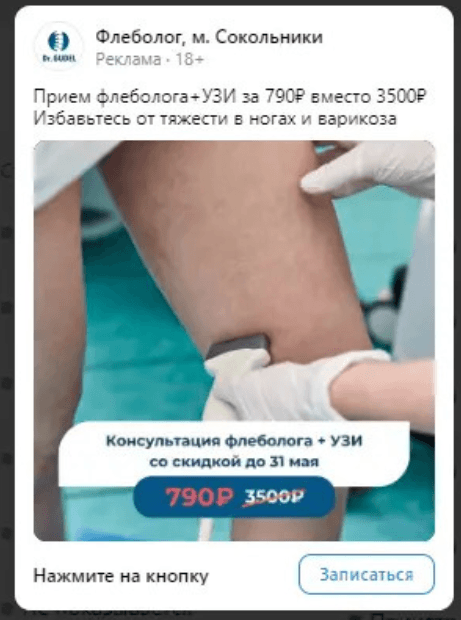 К нам обратилась клиника, одно из ключевых направлений которой — флебология. Перед нами поставили две интересные задачи: во-первых, привести побольше качественных лидов, а во-вторых, поднять стоимость первичного приема у флеболога с 990 до 1990 рублей.