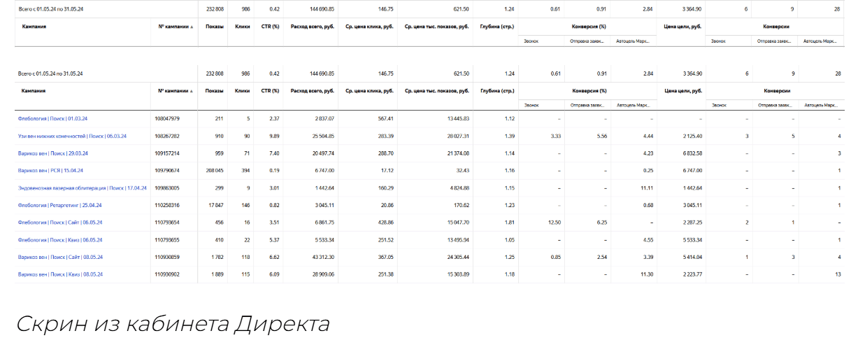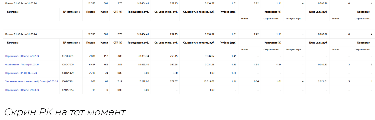 Мы продолжаем вести и оптимизировать рекламные кампании, которые дают стабильный поток заявок. Постоянно тестируем новые гипотезы, чтобы снижать стоимость лида и получать еще больше обращений. А клиника тем временем расширила штат флебологов, которых теперь нужно обеспечить пациентами, чем мы и занимаемся
