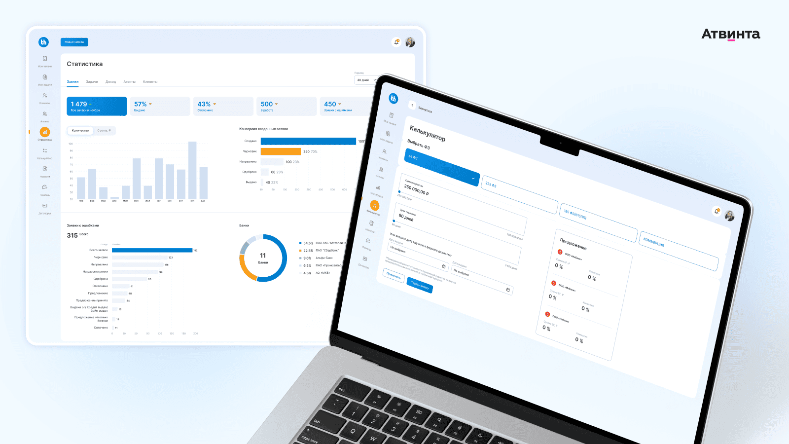 Добавили разделы «Калькулятор» и «Статистика». Первый помогает агентам быстро рассчитать параметры заявки в зависимости от суммы и срока. Второй дает аналитикам и менеджерам возможность видеть количество заявок, процент отклонений и ошибки.