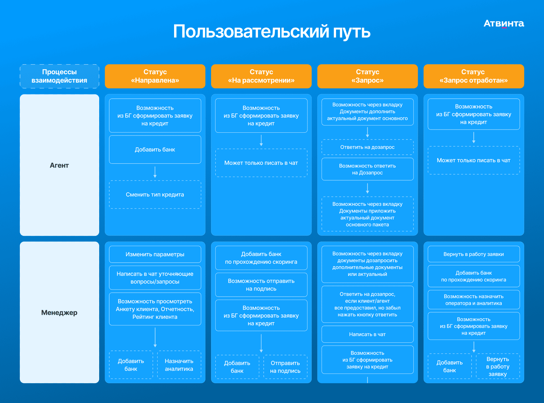 На основе собранных данных мы спроектировали пользовательские сценарии по ролям и статусам заявки в системе.