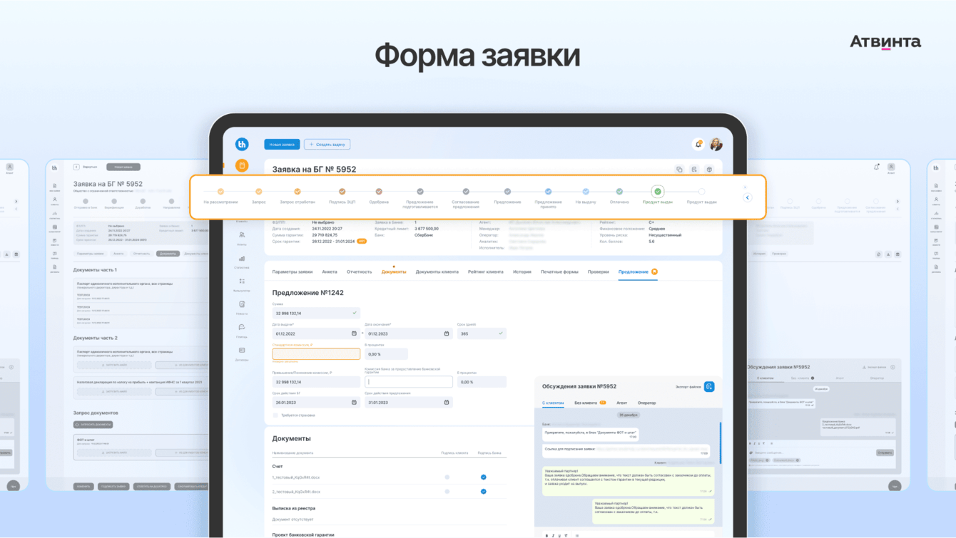- Упростили процесс работы с заявкой. Каждый шаг визуально подсвечен и находится на виду. Это снижает количество ошибок и увеличивает скорость оформления.