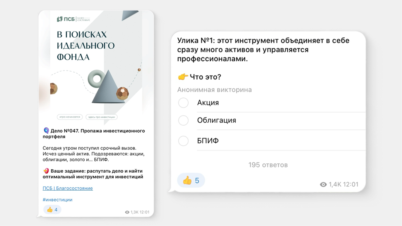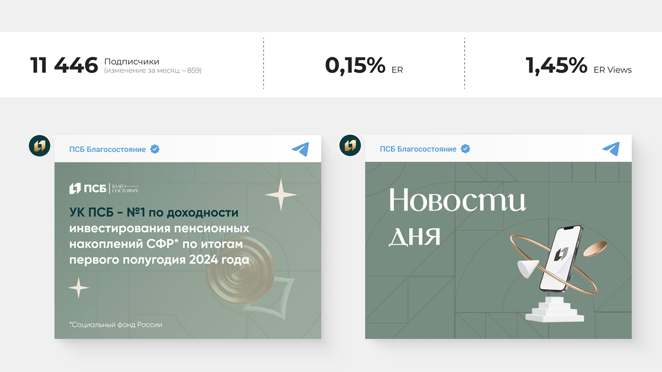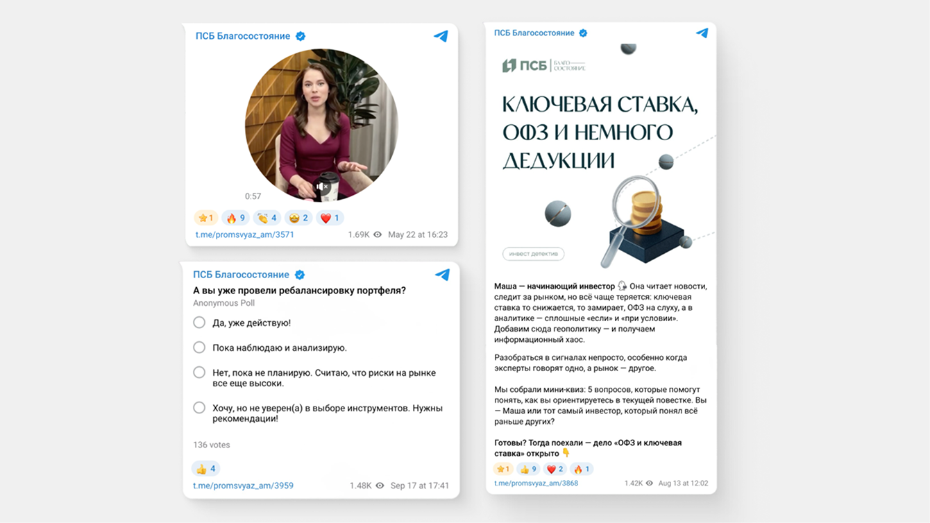 Когда мы начали работать с Telegram-каналом ПСБ Благосостояние, ключевая цель состояла в том, чтобы повысить вовлечённость и превратить канал в коммуникационную площадку для инвесторов. Мы сосредоточились на контенте, который формирует доверие, развивает экспертность и поддерживает интерес аудитории к аналитике.