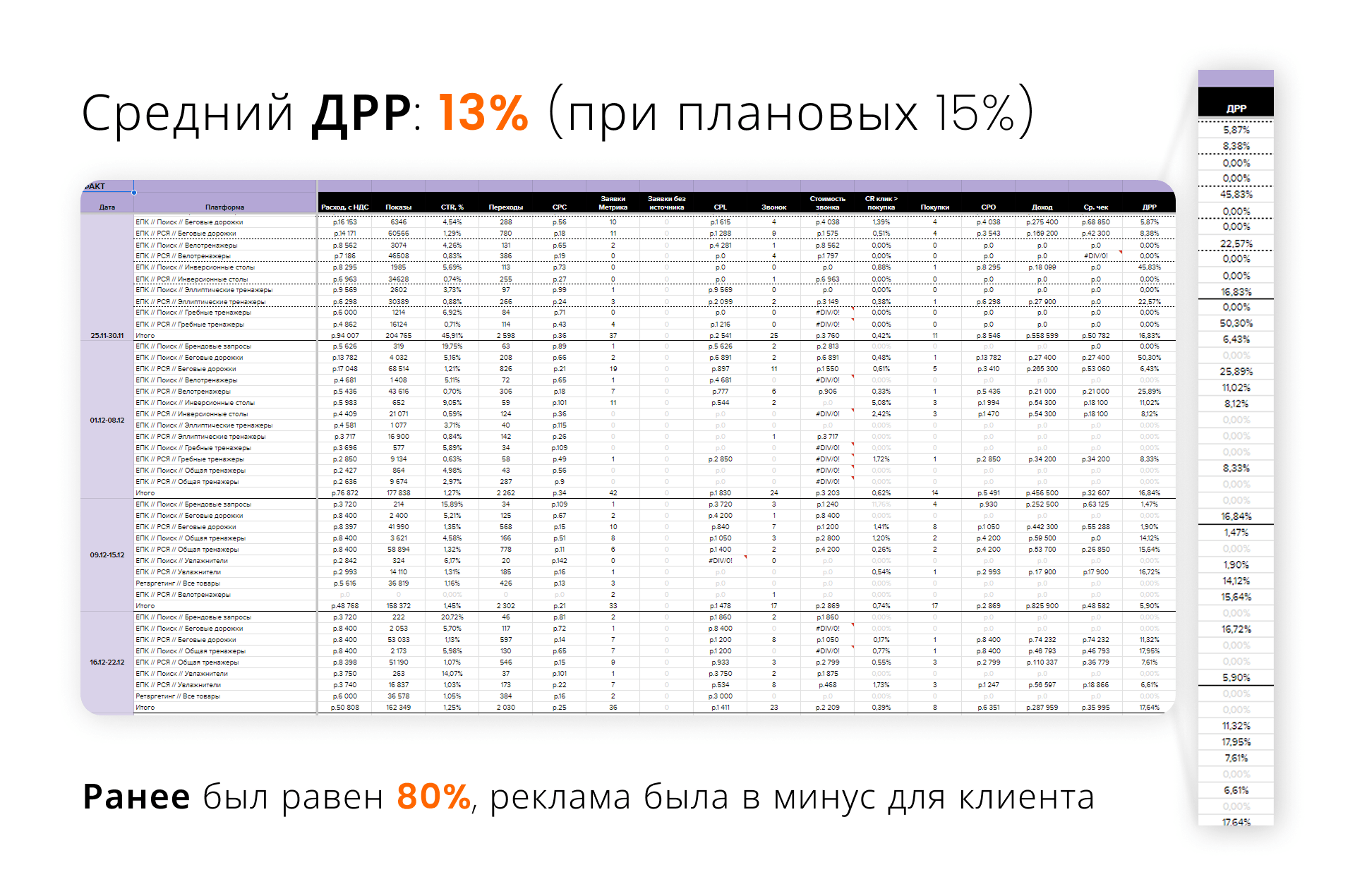 Благодаря комплексному подходу к оптимизации контекстной рекламы нам удалось значительно повысить эффективность рекламных кампаний. Средний ДРР составил 13% при плановых 15%, что говорит о высокой результативности проделанной работы.
