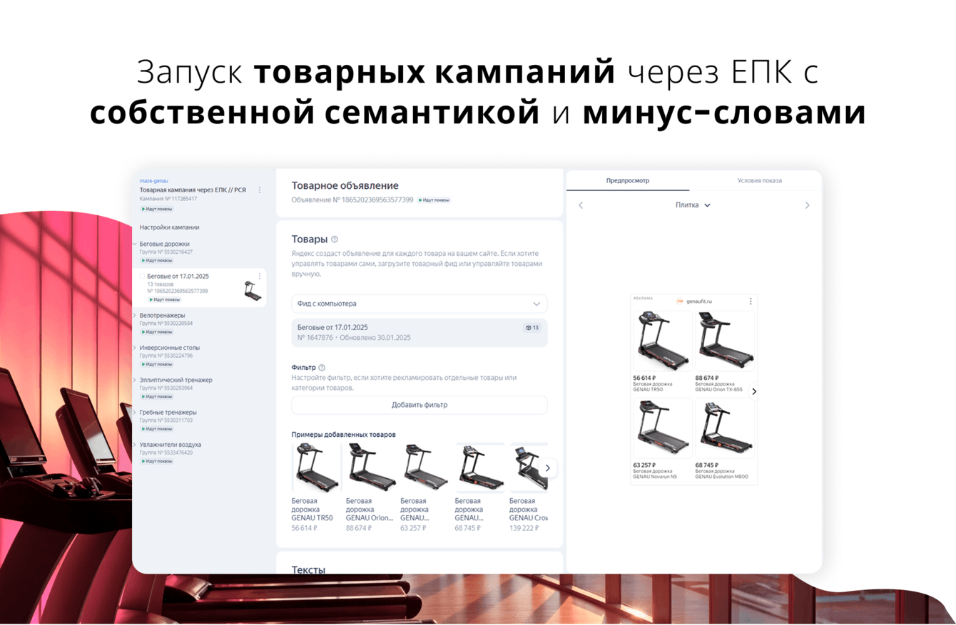 Товарные кампании мы запустили через ЕПК, дополнив их собственной семантикой и минус-словами для более точного таргетинга и исключения нецелевого трафика.