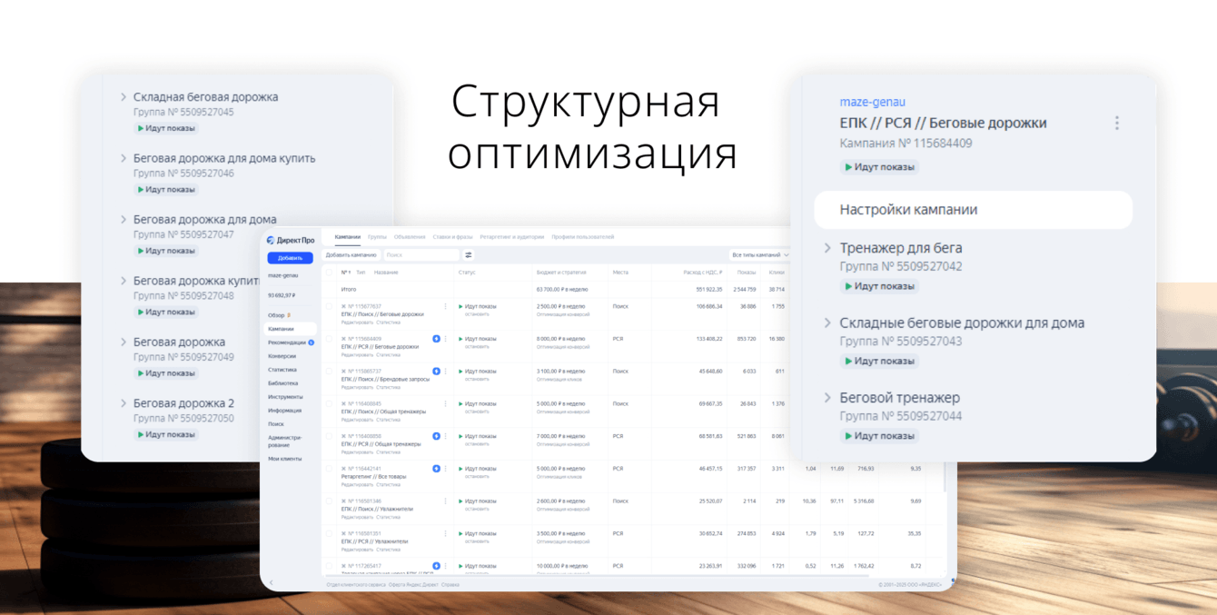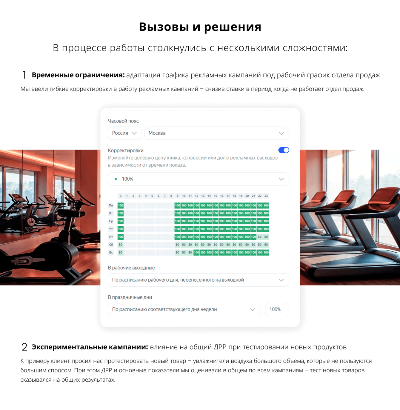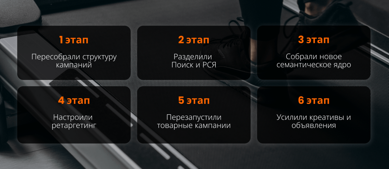 Разделение кампаний по категориям товаров (беговые дорожки, велотренажеры, увлажнители) с отдельным ведением Поиска и РСЯ;