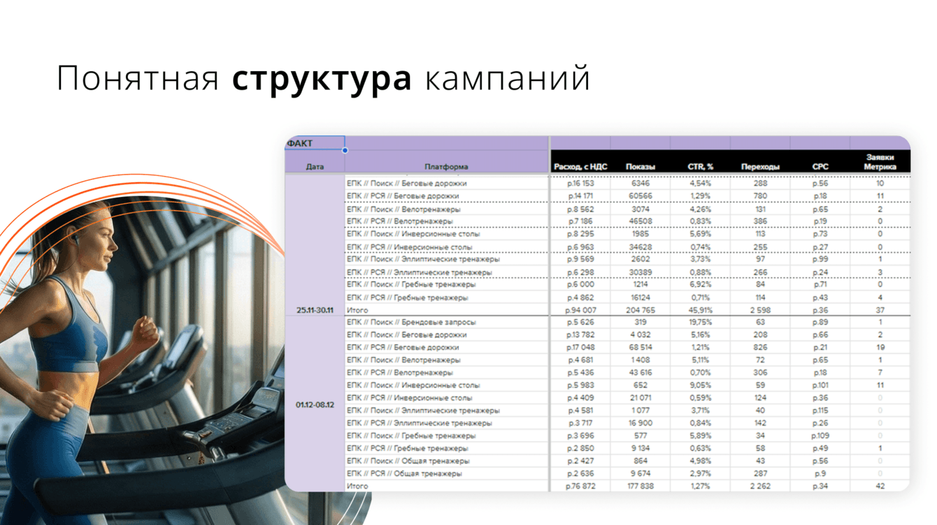 Мы выстроили понятную структуру кампаний: сразу видно, сколько тратится на каждый вид продукта, а значит — можно гибко перераспределять бюджет в зависимости от задач. Например, оперативно усиливать продвижение конкретных тренажёров во время акций.