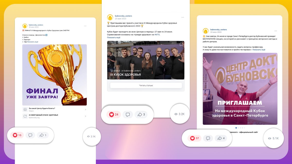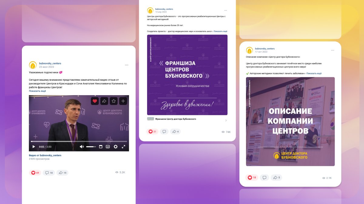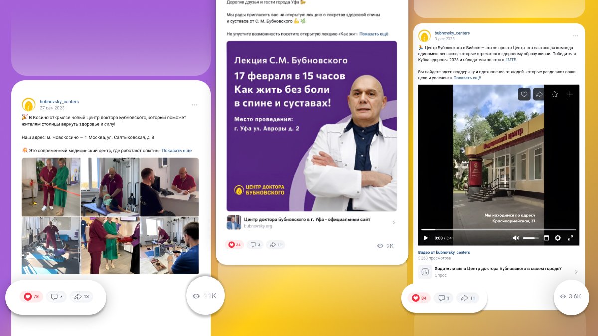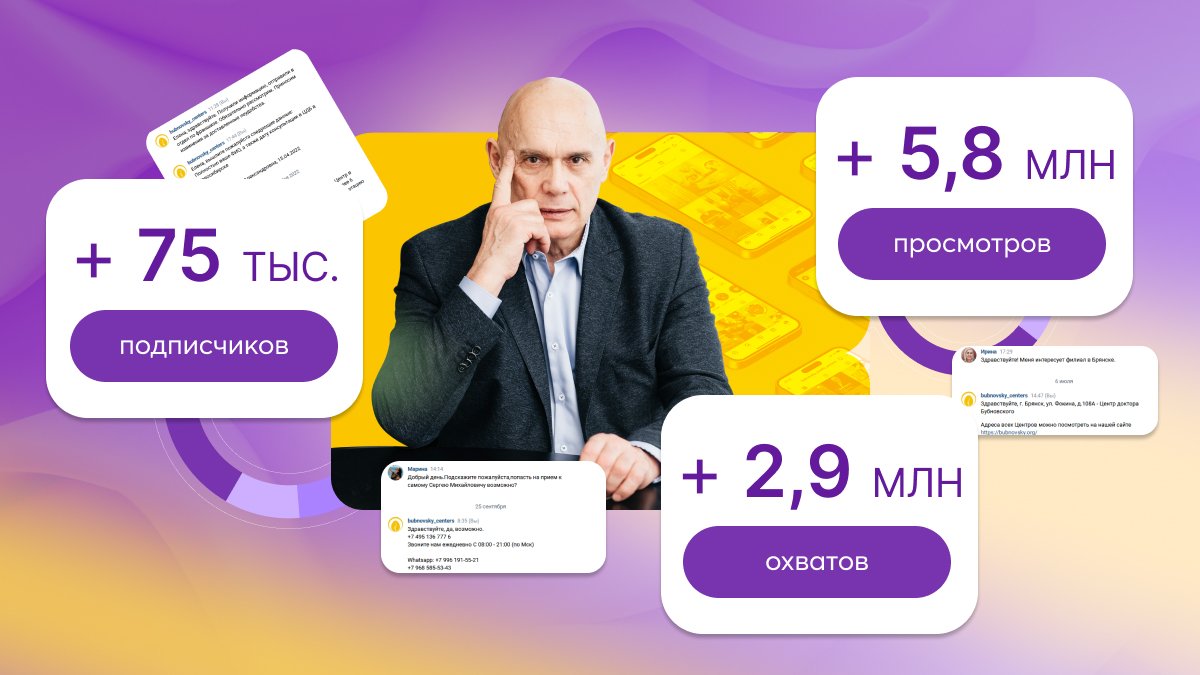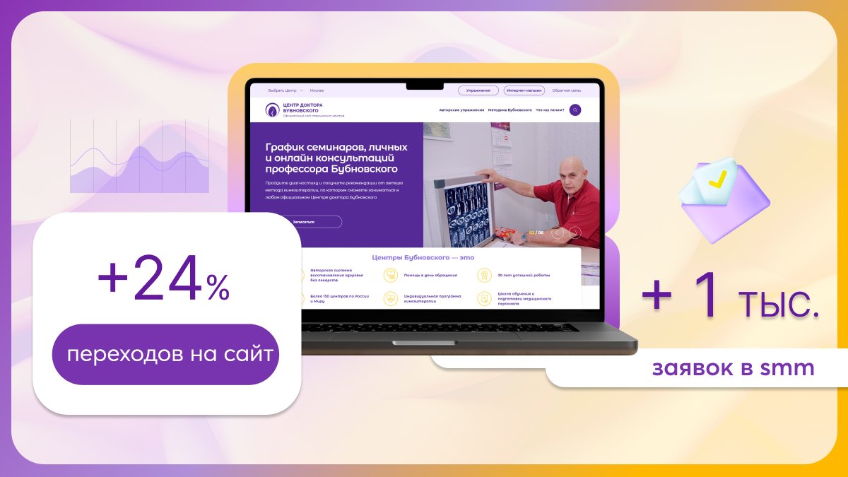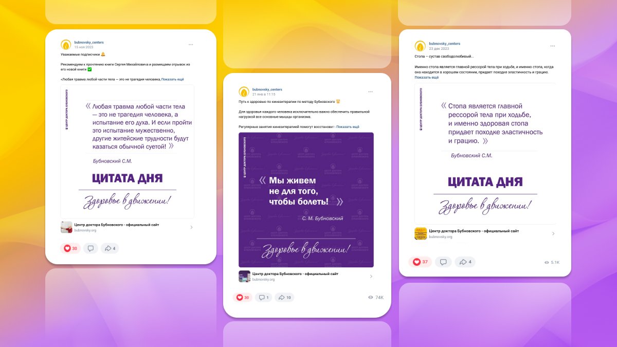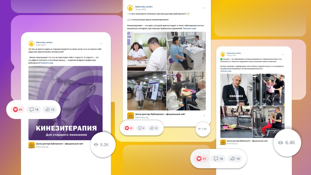 В 2022 году мы столкнулись с задачей создания аккаунтов в социальных сетях с целью продвижения бренда Бубновского и увеличения количества пациентов в Центры по всей России. Ранее мы вообще не уделяли внимания smm. Сегодня наши аккаунты стали эффективным инструментом привлечения новых пациентов и партнеров. Благодаря интересным публикациям, методика лечения кинезитерапии стала более доступной и понятной для потенциальных пациентов, что привело к увеличению обращений в наши Центры, а также расширению сети Центров.