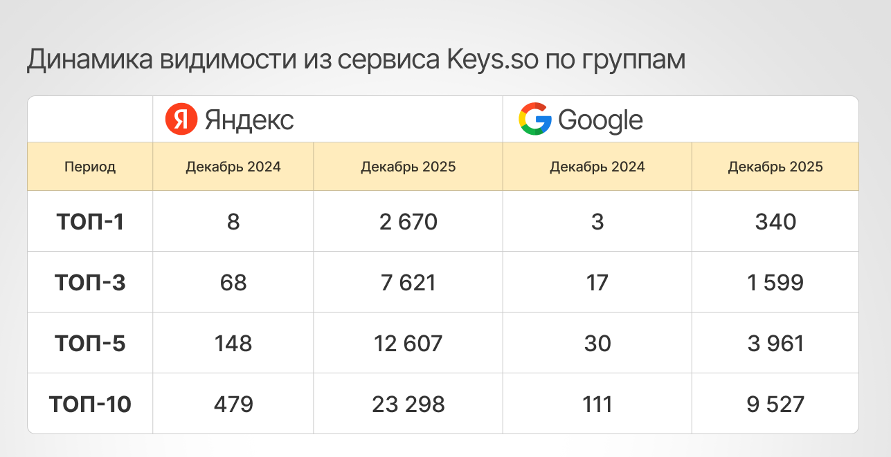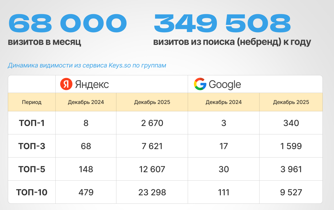 Параллельно выросла и видимость сайта в поиске. Количество запросов в ТОП-10 увеличилось в десятки раз как в Яндексе, так и в Google — сайт начал занимать позиции по тысячам информационных запросов, по которым раньше не ранжировался.