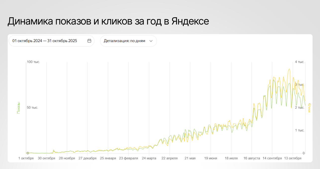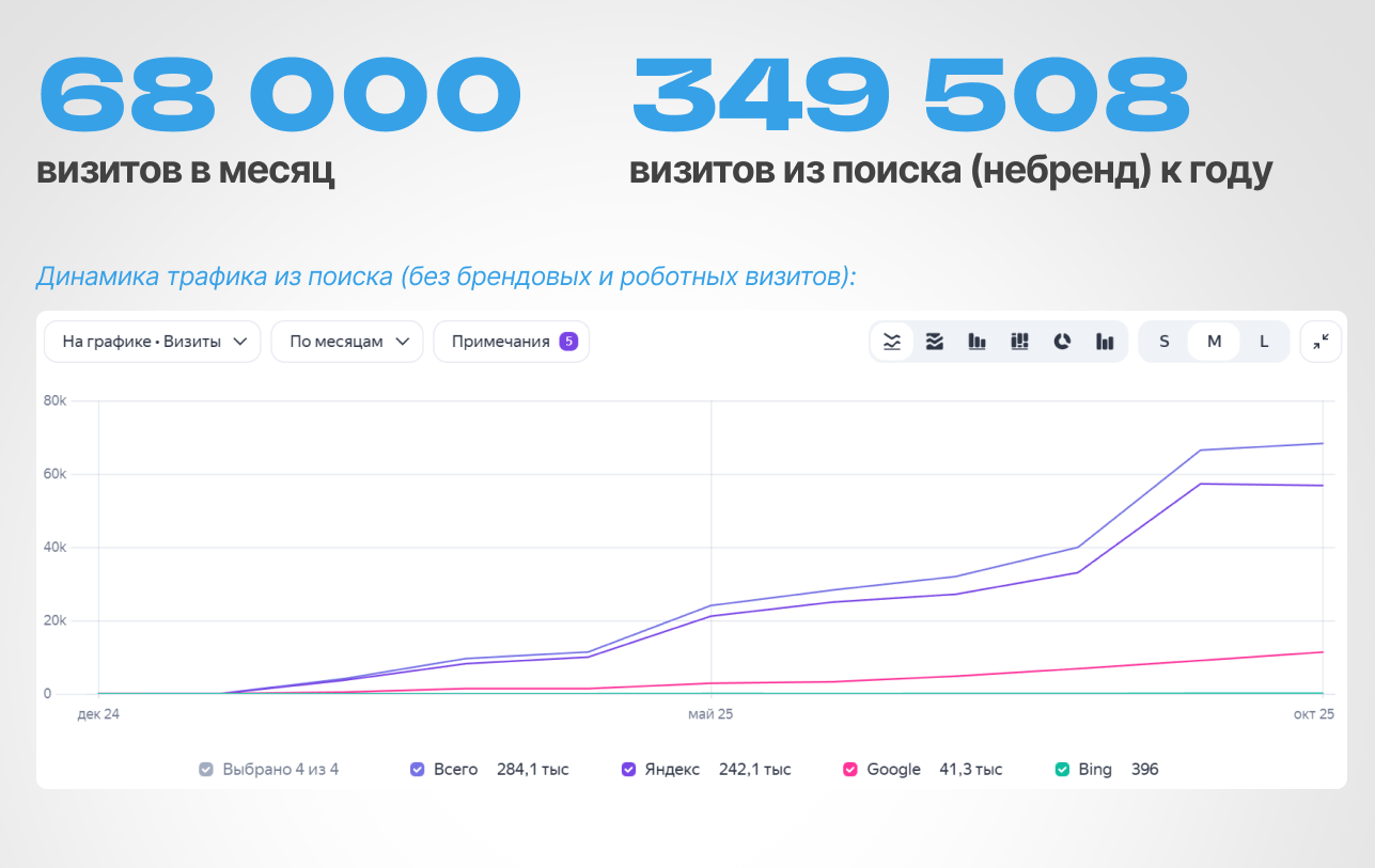 И важный момент: клиент не хотел ждать «когда-нибудь потом». Нужен был понятный рост трафика в разумные сроки и четкое понимание, за счет чего он происходит.