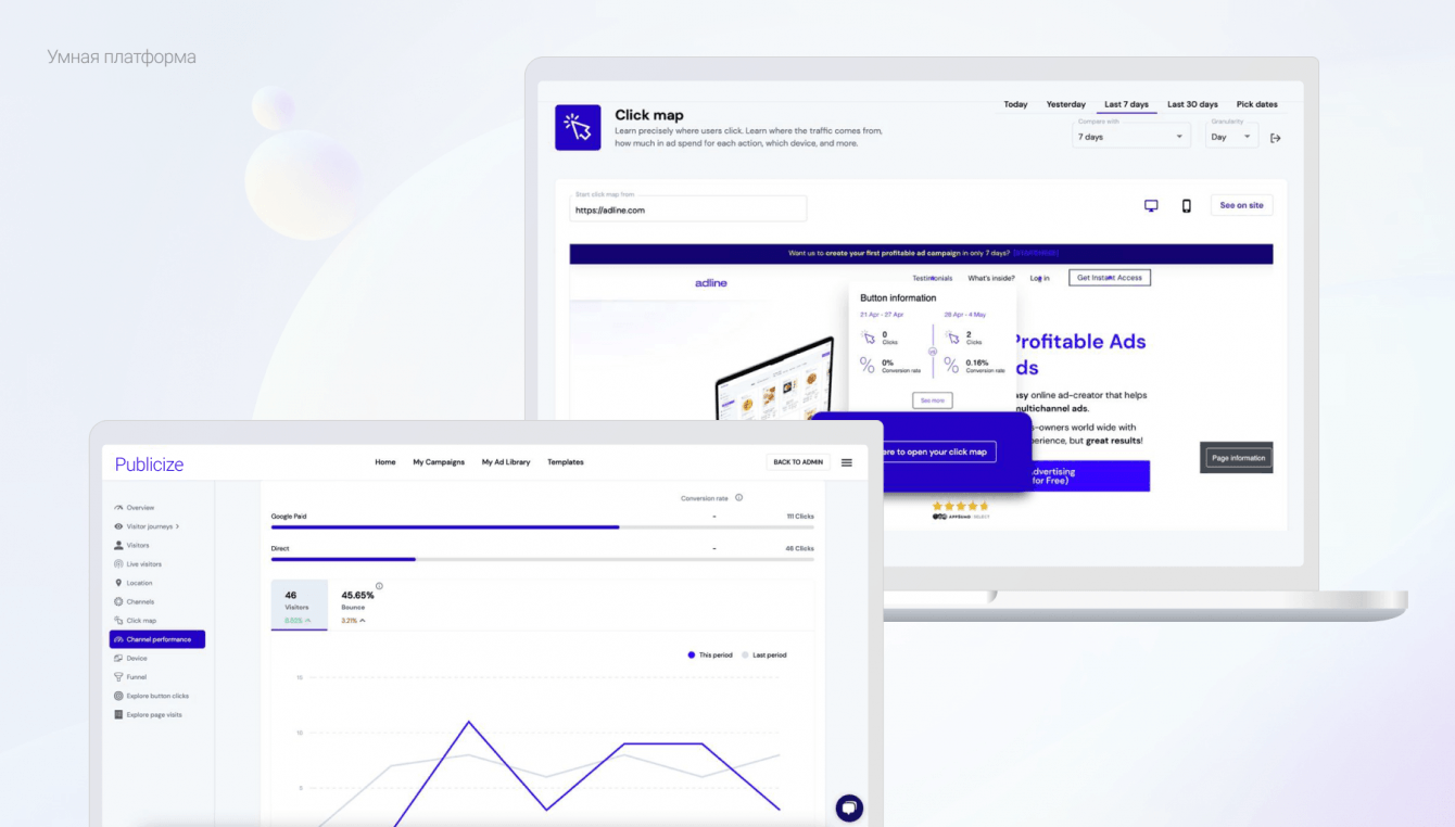 Если вам доводилось запускать, например, рекламу в Google, то вы уже знаете, как выглядит боль. В их кабинете миллион функций и настроек — разобраться без помощи специалиста практически невозможно. Мы учли это при создании кабинета Publicize. Он устроен так, чтобы любой человек мог запустить свою первую кампанию за несколько минут. Оставили только самые важные функции, убрали все лишнее.