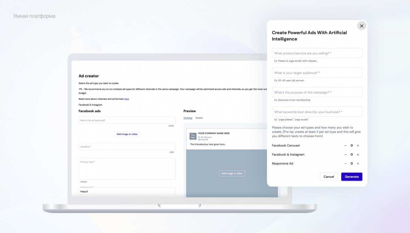 В реальности приходится тратить много времени на запуск рекламы на нескольких площадках одновременно — каждый раз заново заполнять формы, настраивать метрики. В Publicize это делается в одном месте и сразу на все кампании. Пользователь заполняет одну форму, и объявление автоматически адаптируется под разные рекламные площадки.