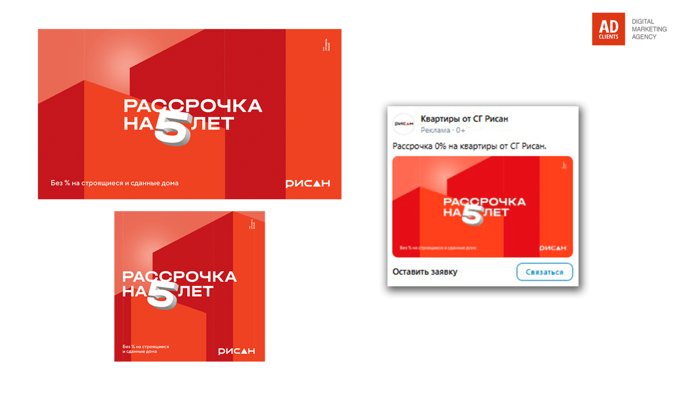 Ключевое предложение должно было первым бросаться в глаза. Поэтому баннер разработали яркий - красная цветовая гамма выделяла объявление на фоне интерфейса Вконтакте, а фраза про рассрочку повторялась несколько раз: в креативе, в заголовке и тексте объявления - во всех форматах и на всех плейсментах VK Рекламы.