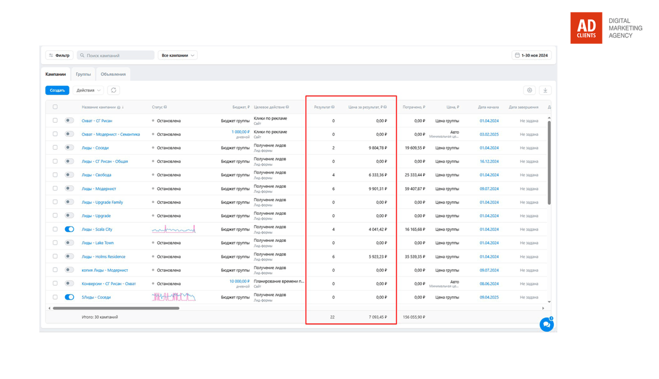 Сравнение данных по заявкам из кабинета VK Рекламы за ноябрь 2024: