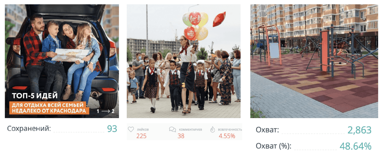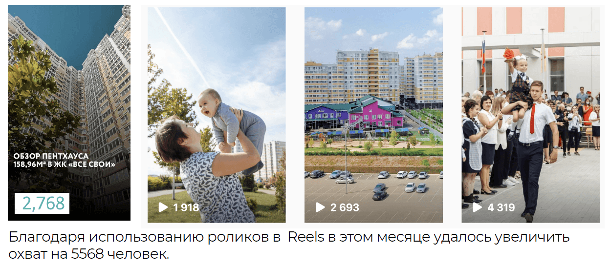 Благодаря упору на живой контент (отзывы жителей, конкурсы с упоминаниями, рекламные интеграции с блогерами, Reels о преимуществах ЖК, румтуры по квартирам) нам удалось увеличить увеличить средние охваты аккаунта СК "Семья" в Instagram на 13%, количество упоминаний - в 2,3 раза, количество обращений - в 1,5 раз.