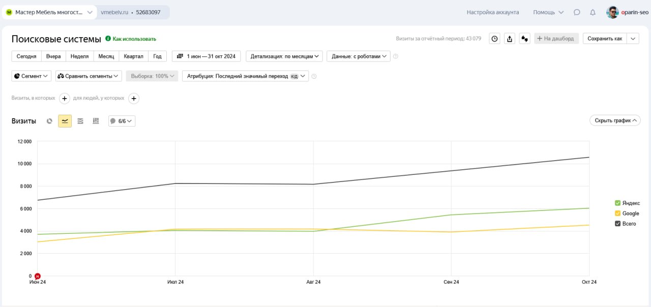 Колоссальный объем работы, проделанный за 5 месяцев интенсивной SEO-кампании, принес поистине впечатляющие результаты. По итогам сентября 2024 года органический трафик на сайт клиента вырос до 10500 переходов в месяц. Это означало увеличение на 57% по сравнению с исходным показателем в 6700 переходов до начала нашего сотрудничества.