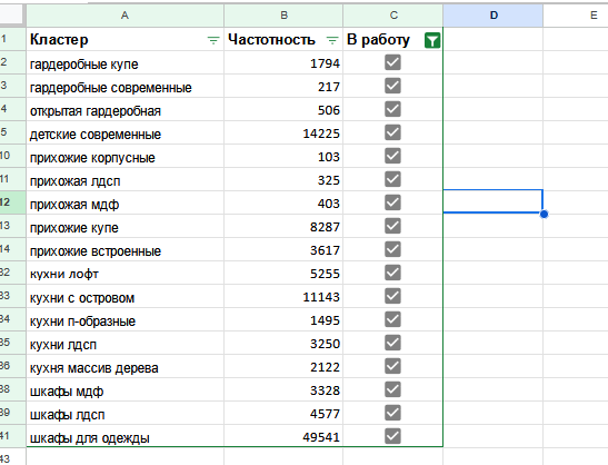 2. Дополнение ассортимента. Анализ показал наличие множества продуктовых кластеров, вообще не представленных на сайте. Сюда входили разнообразные типы шкафов, комодов, тумб и иной мебели, пользующиеся высоким спросом.