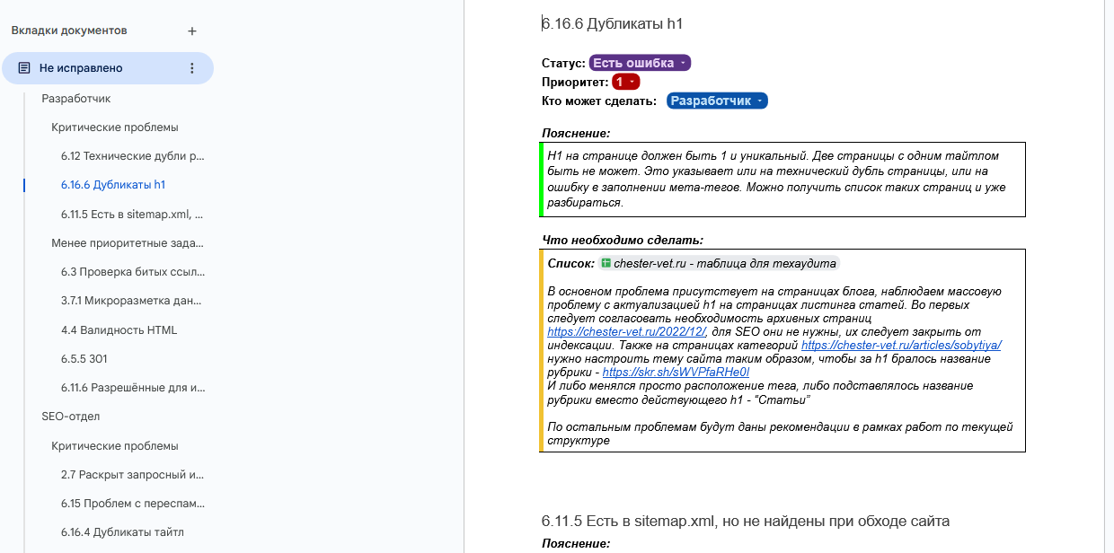 На сайте были выявлены отдельные технические проблемы, такие как битые ссылки, неправильные метатеги, а также другие мелкие ошибки, которые могут влиять на индексирование и поведенческие факторы. Хотя количество этих ошибок было минимальным, они всё равно требовали внимания.