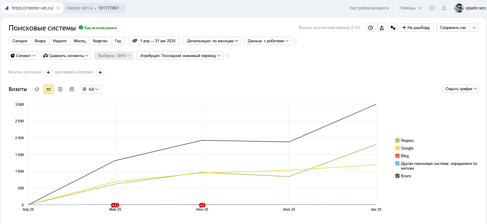 После того как мы внедрили все ключевые изменения на сайте Chester-Vet.ru - от редизайна и расширения семантики до технической оптимизации - результаты не заставили себя долго ждать. Мы наблюдали значительные улучшения как в органическом трафике, так и в показателях сайта.