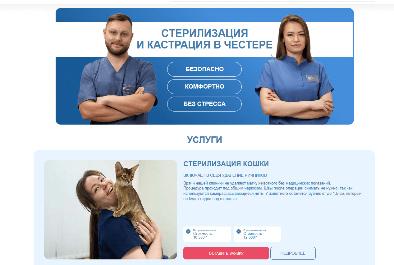 1. Обновление страницы услуги: Страница услуги для ветеринарной клиники - это главный инструмент для привлечения трафика и конверсий. Мы изменили её структуру, улучшив визуальное оформление и добавив удобные формы для записи на приём. Важно было сделать страницу не только привлекательной, но и функциональной: добавили кнопки с призывами к действию, такие как «Записаться на приём» и «Получить консультацию», а также блоки с описанием услуг и рекомендациями. Это увеличивало шансы на конверсию посетителей в клиентов.